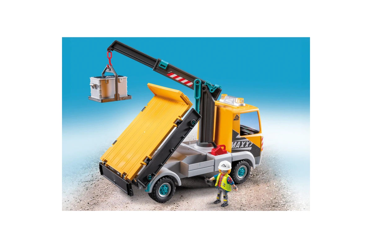 Equip your little builders with the Playmobil Construction Truck with Crane! This big yellow truck features a telescopic arm that extends and swivels, making it easy to maneuver heavy objects on the construction site. The large loading area tilts up and down, while the side sections fold down for effortless unloading.