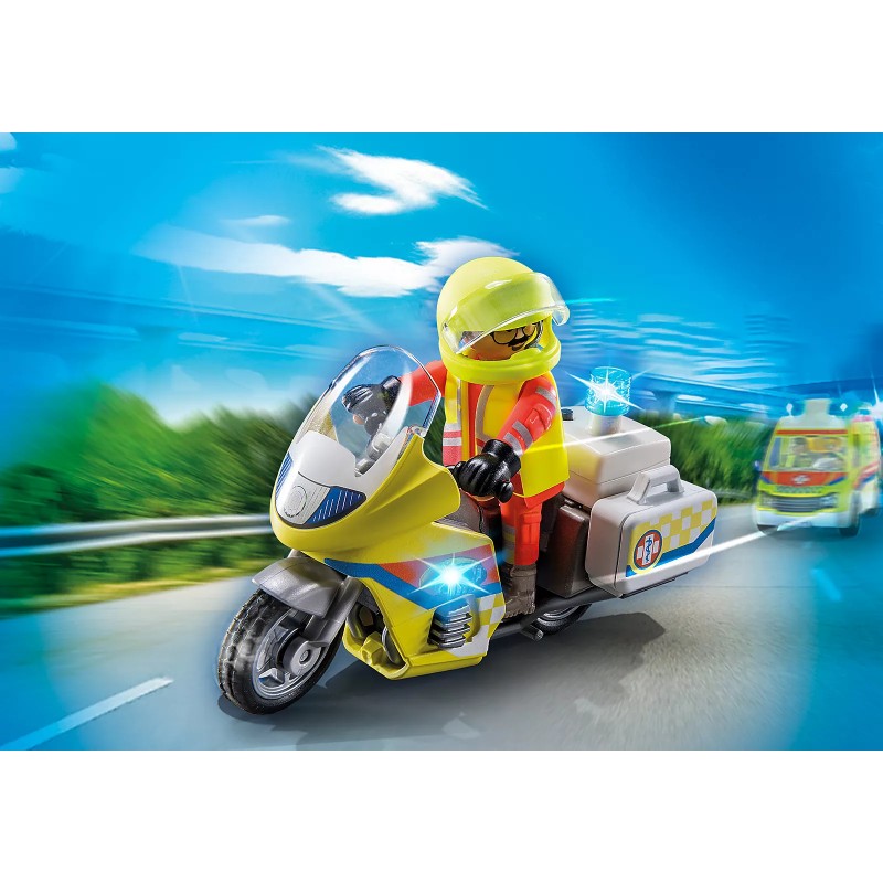 The PLAYMOBIL Emergency Motorcycle with Flashing Light is a great addition to your PLAYMOBIL range. The flashing lights at the rear and in the side fairing, flash alternately when switched on and have an auto power-off function after 60 seconds.