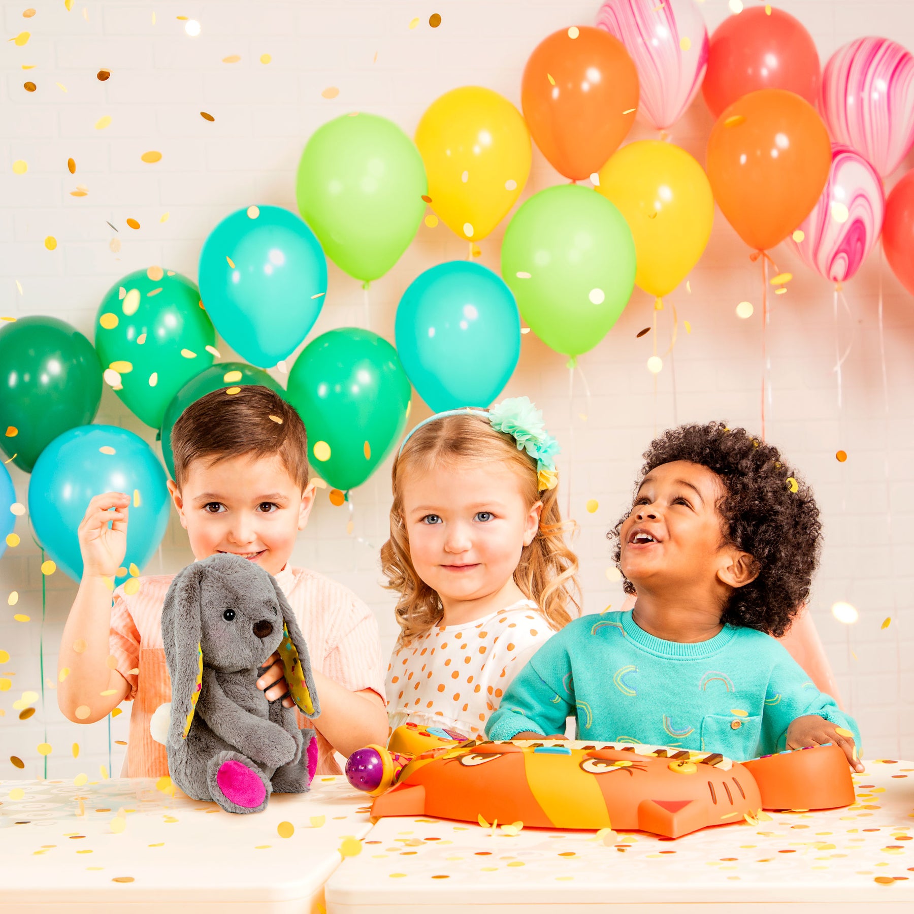 Snuggle the days away with the Happyhues Sprinkle Bunny from B. softies! This super-soft and squishy plush bunny has a cool grey coat, honey-mustard confetti-print ears, and vibrant magenta paws. This huggable rabbit is great for playtime, naptime, and anything-you-want time – from birth and beyond. Little ones can safely spend hours snuggling this fluffy friend because she's made with high-quality materials that are BPA-free and PVC-safe. Not to mention, this stuffed animal is easy to take care of – it's machine-washable, after all! Sprinkle Bunny is also created with durability in mind, because we at B. craft timeless toys that are meant to fill not only years, but generations, with love.