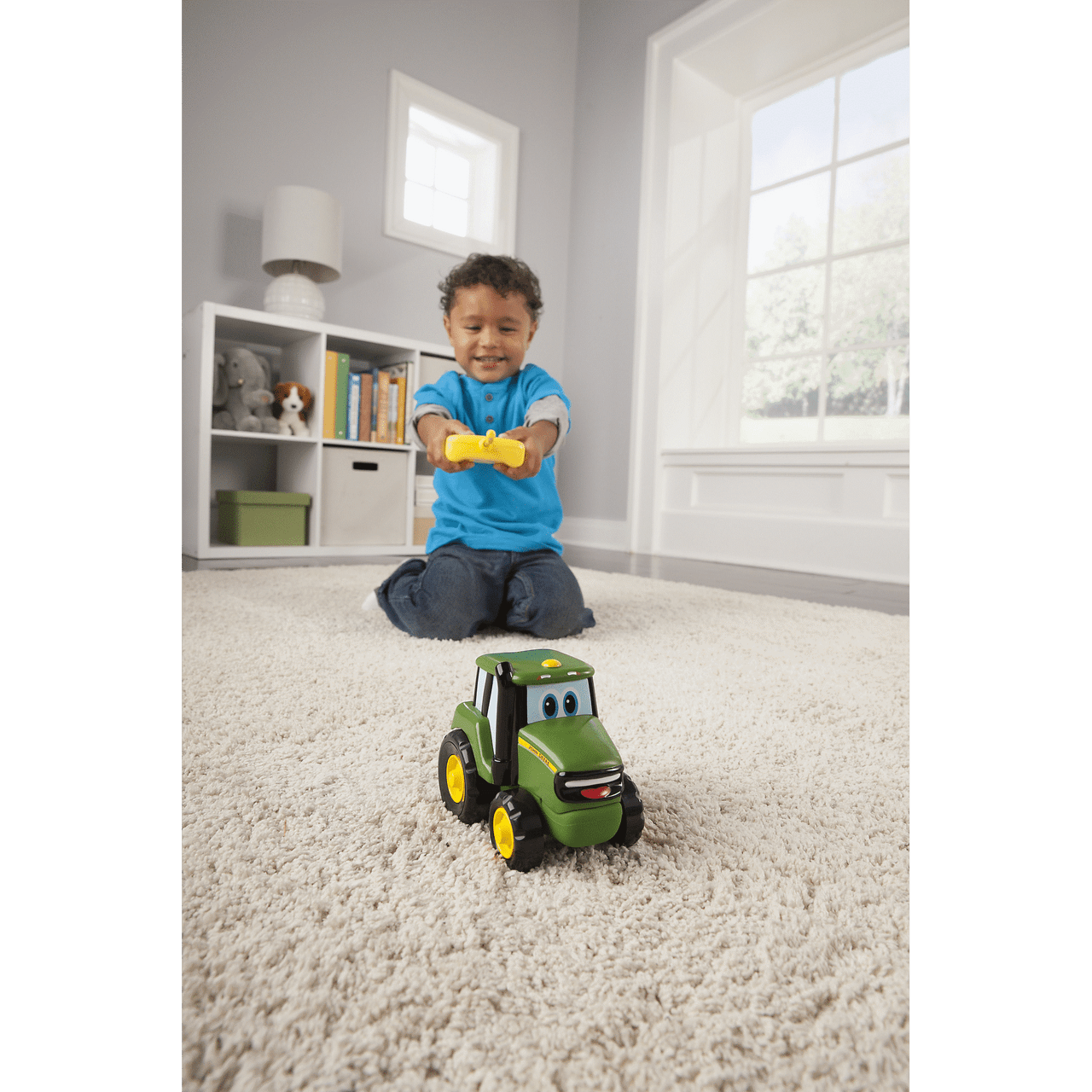 The Johnny Tractor RC is the perfect first radio control for toddlers! Featuring a simple, two-button controller, little ones will love to drive Johnny around while making him twist and turn. Johnny is durable enough to take bumps and bounces, yet soft enough that he won’t mark up walls or furniture.