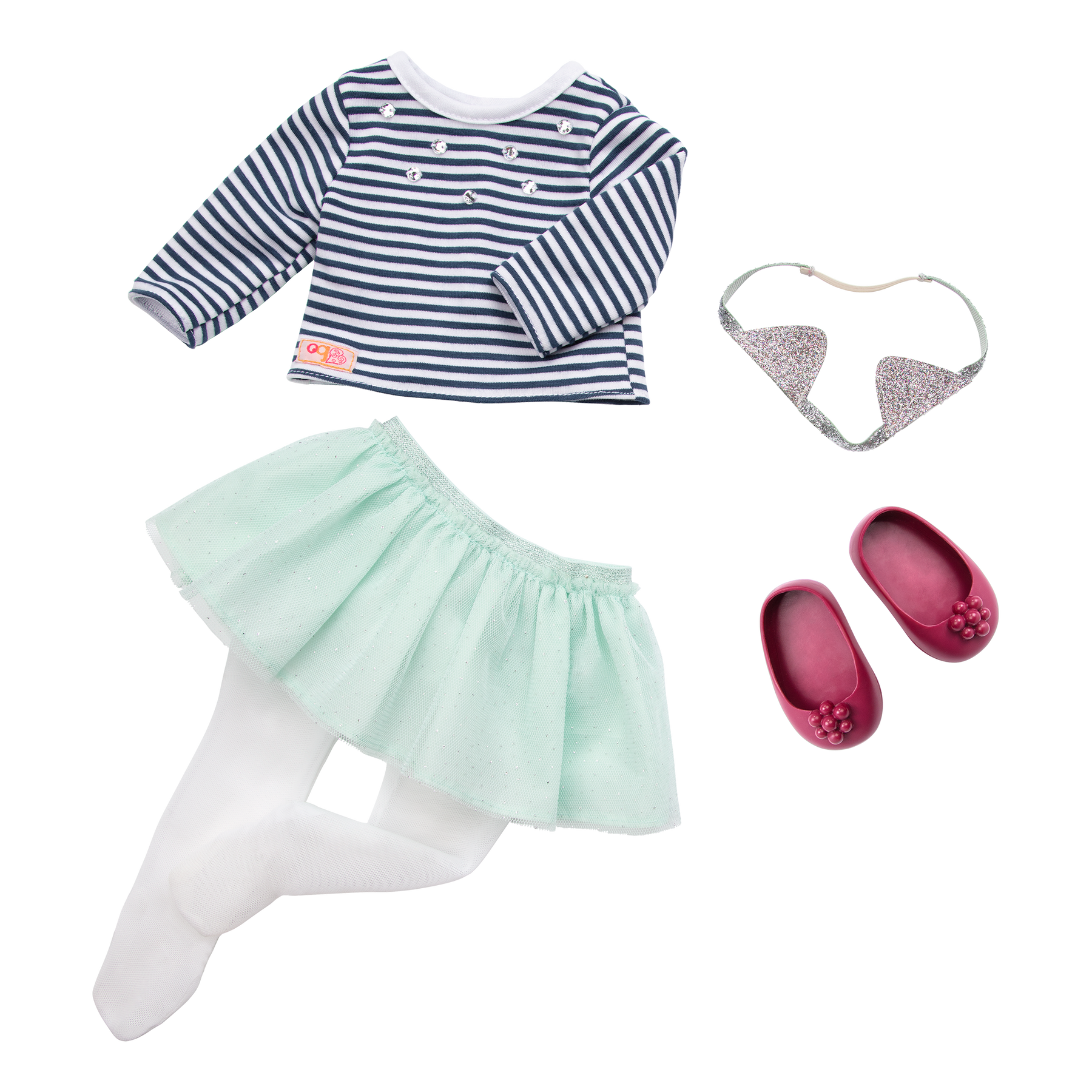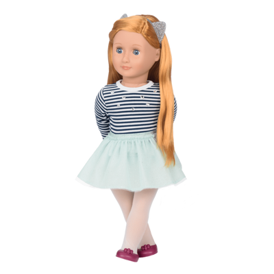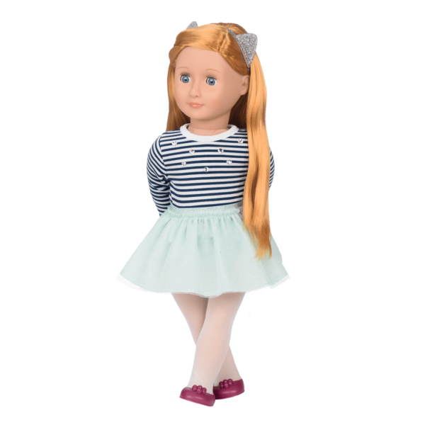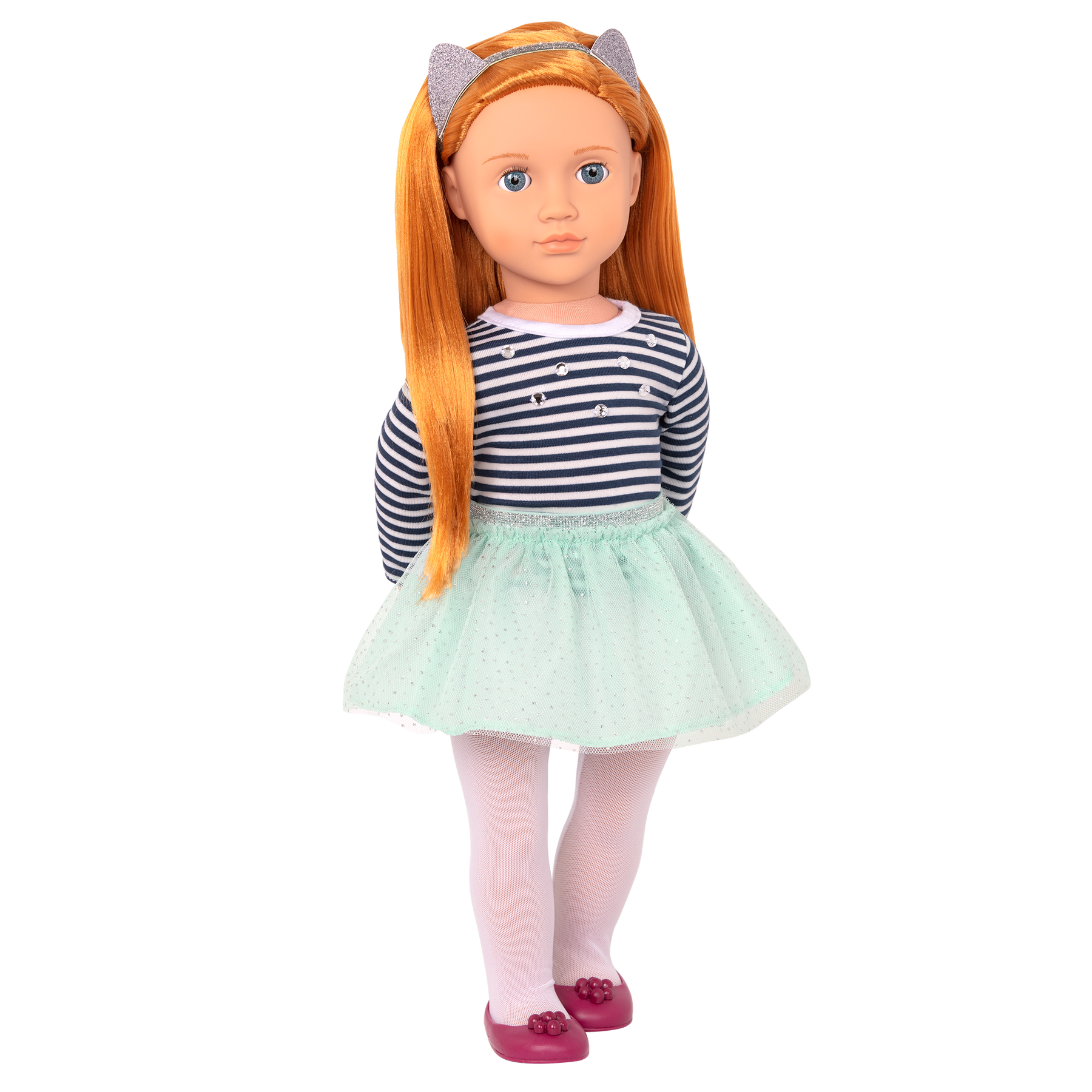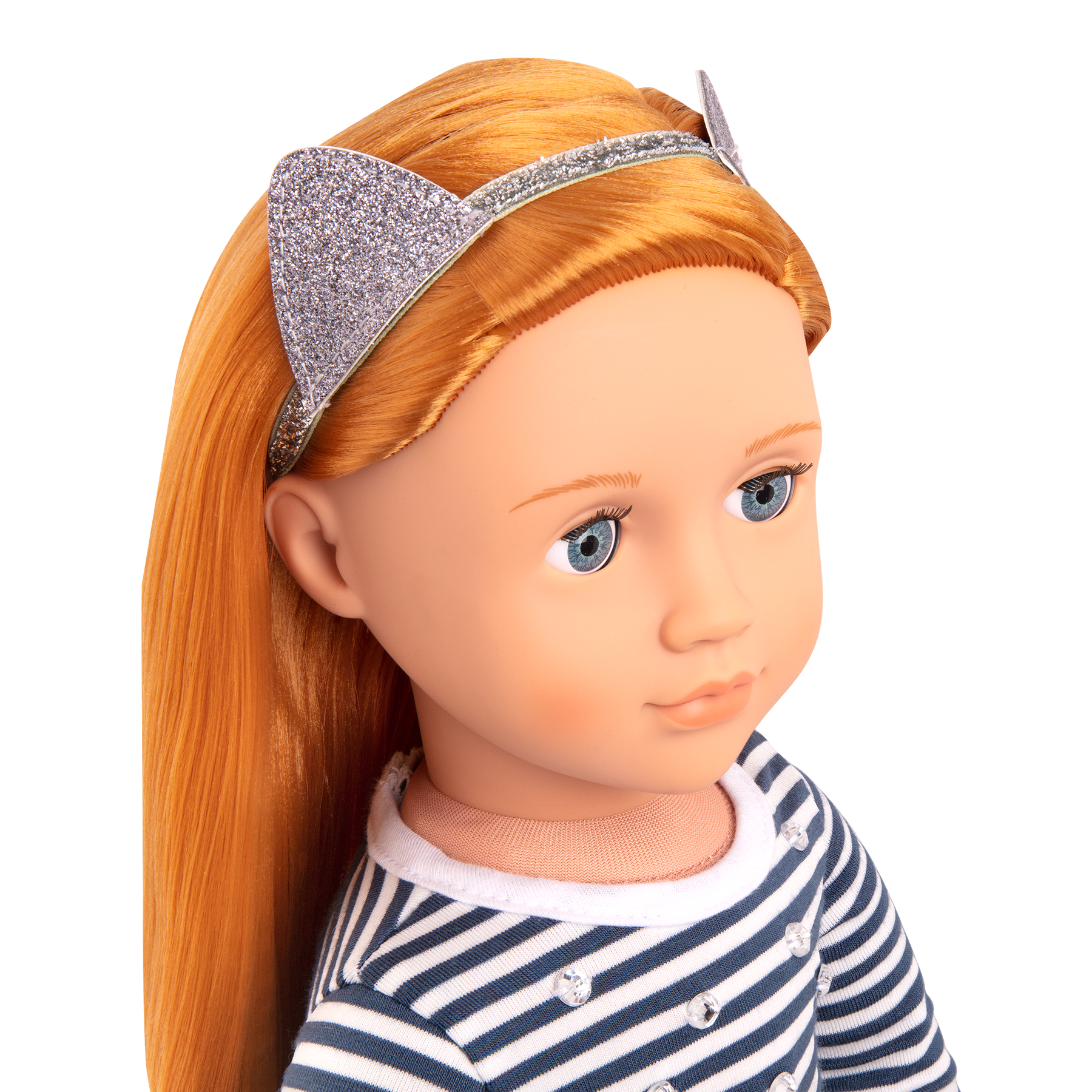 It's a purr-fect day for fun and adventure with Arlee, a beautiful Our Generation 18" doll with bright-blue eyes and long, straight, copper-red hair. Arlee's hair is silky soft and fun to brush and style. She wears a wonderful outfit that is a little bit silly, a little bit sparkly, and a lot of fun! Her outfit includes a long-sleeved striped t-shirt with sparkly gem embellishments on the front. She wears a seafoam-green skirt, pale tights, and red flat shoes. To top it all off, Arlee wears an adorable silver glitter cat-ear headband! Meow that's a great way to add some sparkle when you're "feline" silly!