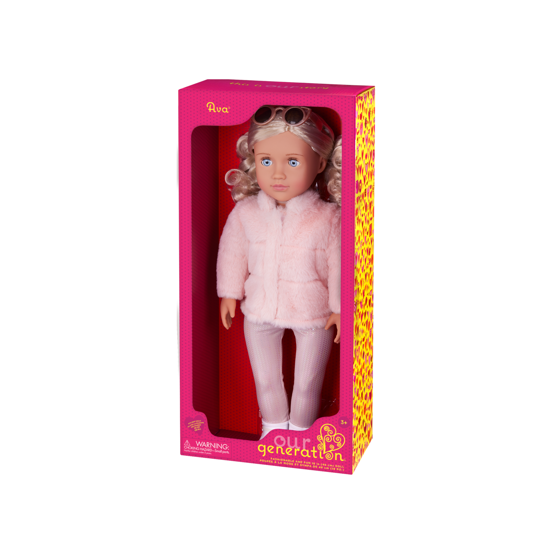 Explore fun styles and awe-inspiring looks with Ava! This Our Generation 18-inch doll has a huggable soft body and lifelike features to delight doll fans during playtime. Her light-blue eyes open and close, and her wavy, light-blonde hair is fun to style in many ways! Ava always sets her sights on trendy fashion. She arrives wearing a faux-fur coat in a lovely pink shade, matching leggings, and cute booties. She even lets her playful side shine with a pair of cat-ear sunglasses! When it's time for dress-up, her outfit has easy-open closures to quickly put on and remove. So you can mix, match, and create more stylish looks on any adventure! Our Generation dolls make a great gift for kids ages 3+ (small parts), encouraging them to imagine their own unique stories.