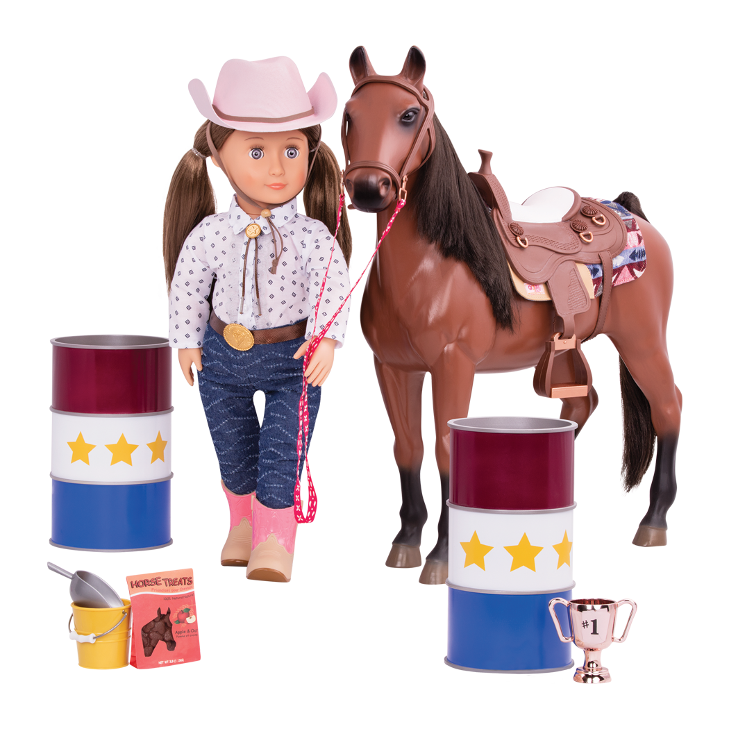 Rodeo wranglers, get ready to ride with the Our Generation Barrel Racing Set for 18-inch dolls! These exciting equestrian accessories will have you turning around the arena in no time. Saddle up with the western-style saddle, pretty saddle blanket, and bridle and reins set. Set up your barrels, pop on your cowgirl hat, and giddy up for the perfect cloverleaf to take home the trophy! Reward your horse with treats after all that hard work. Which horse will you bring to the barrel race? Compatible with most 18-inch dolls, horse toys, and accessories. Our Generation dolls and horses sold separately.