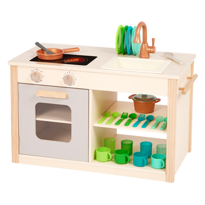 Made of smooth, solid wood and safe for tiny hands, this wooden play kitchen is designed for kids 2 years and up
