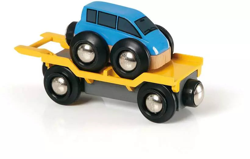 Add this car transporter to your ever growing BRIO railway. Load up the car and couple the wagon up to any BRIO train and off you go. Let the car drive on and off the transporter by tilting the wagon ramp. Attach two or more transporter wagons for added fun. This item includes 1x Transporter wagon, 1x Car and measures 8.6 x 3.4 x 5cm