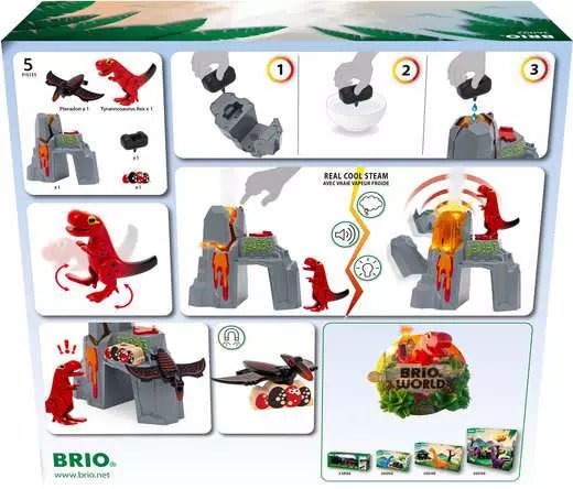 Rumble, boom, crash! The Dinosaur Erupting Volcano is about to blow. Create epic prehistoric adventures by integrating this dinosaur-themed playset and figures into your BRIO World layouts. Wake the volcano by pressing the small button on its peak - activating glowing lava lights, volcano sounds and safe-to-touch steam effects that bloom from the volcano vent. Then watch the volcano explode open as the T-Rex stands proudly at the top, overlooking its kingdom.