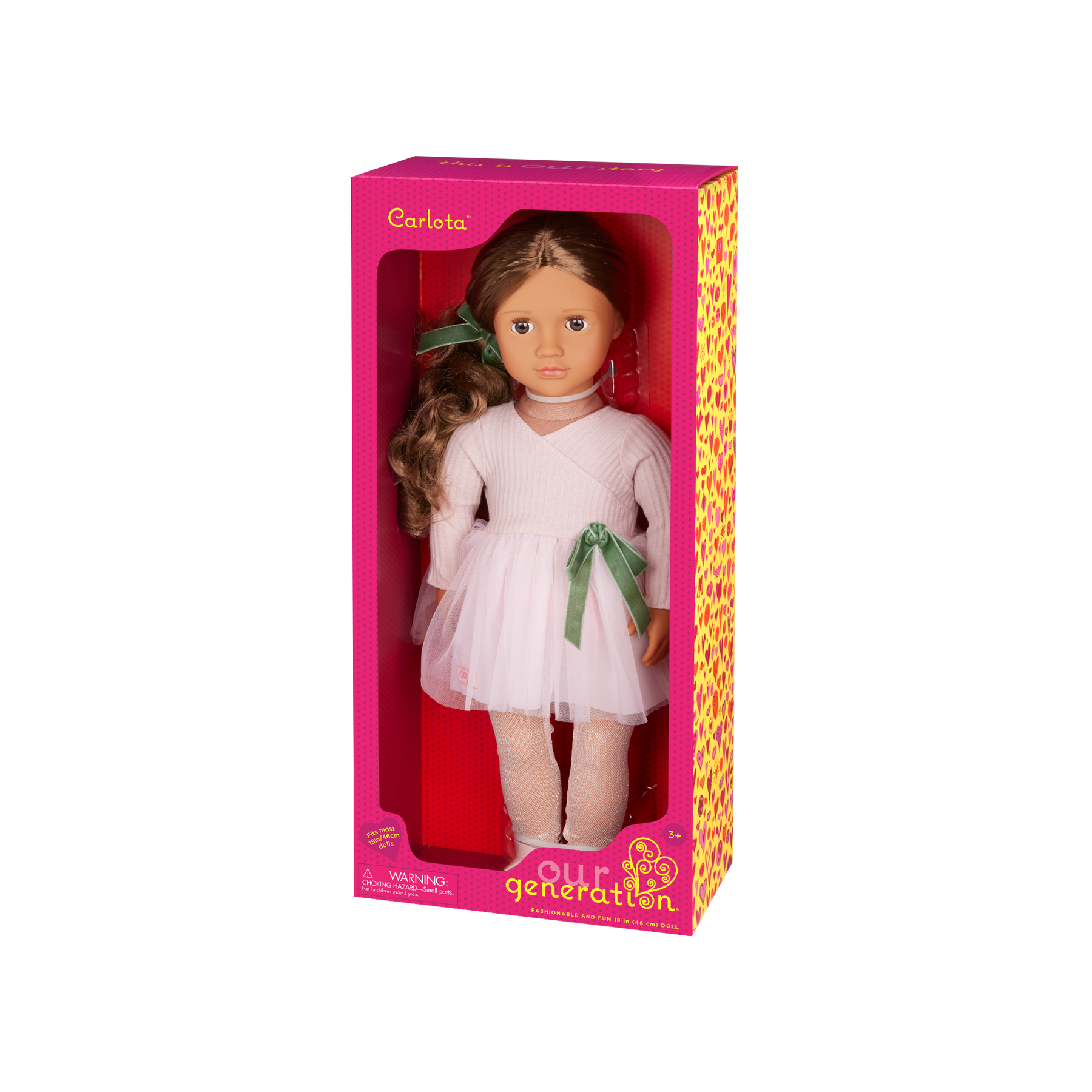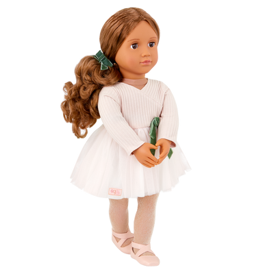 Spin, twirl, and pirouette toward your dreams with Carlota! This Our Generation 18-inch ballerina doll has beautiful brown eyes that open and close with long, wavy brunette hair that's fun to style before her recital! Ready to step into the spotlight? Carlota arrives in a chic ballet dress with a pretty shamrock-green bow, a pair of tights, and ballet shoes. She also has a matching hair bow that highlights her playful spirit! Carlota has a huggable soft body and can rotate her arms and legs when it's time for her big performance. And her outfit has easy-open closures to quickly put on and remove, so you can mix, match, and create more fun looks for her after the show!