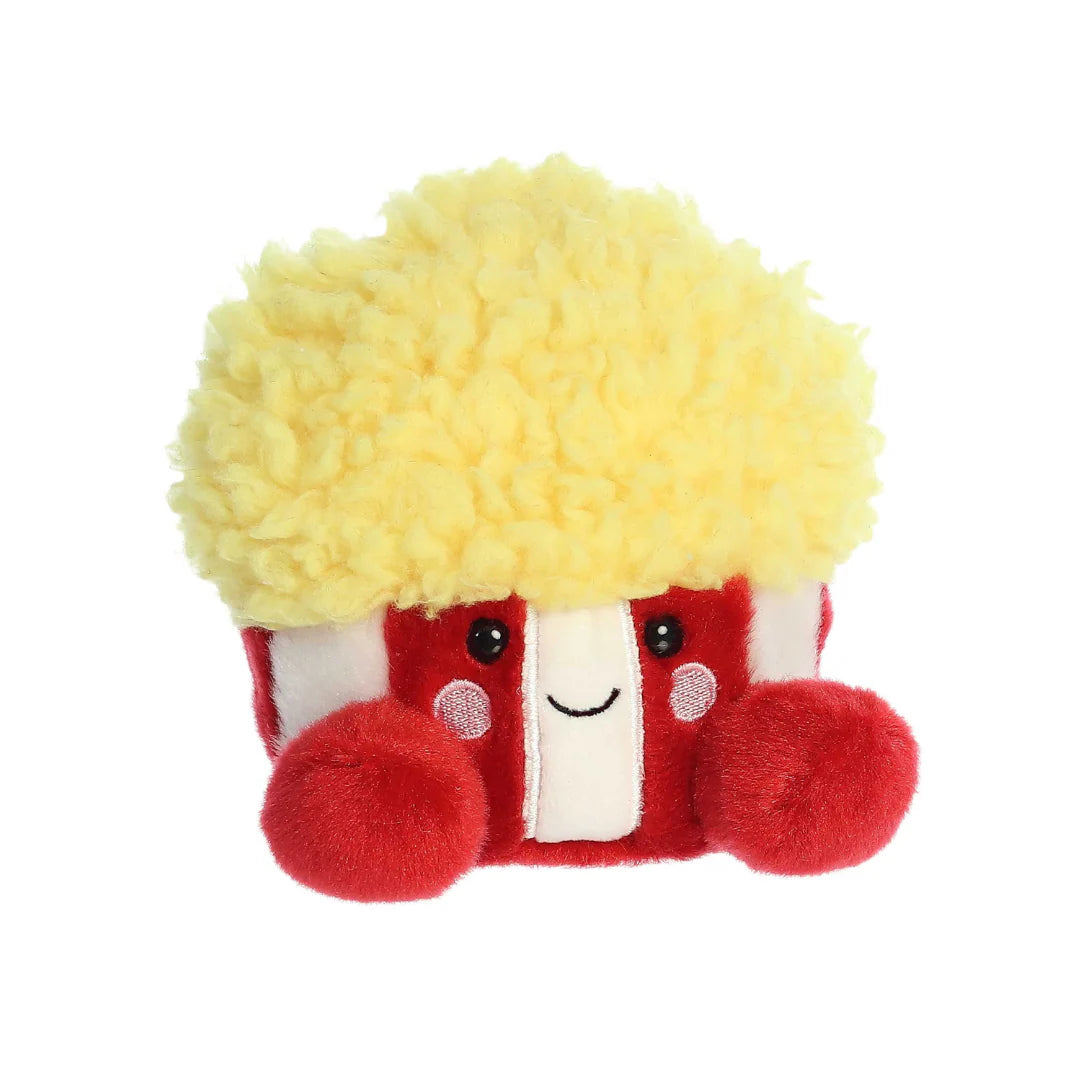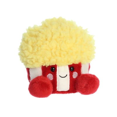 Butters is a fluffy, buttery-yellow plushie with a puffy popcorn top, cuddled up in a bright red and white striped box.