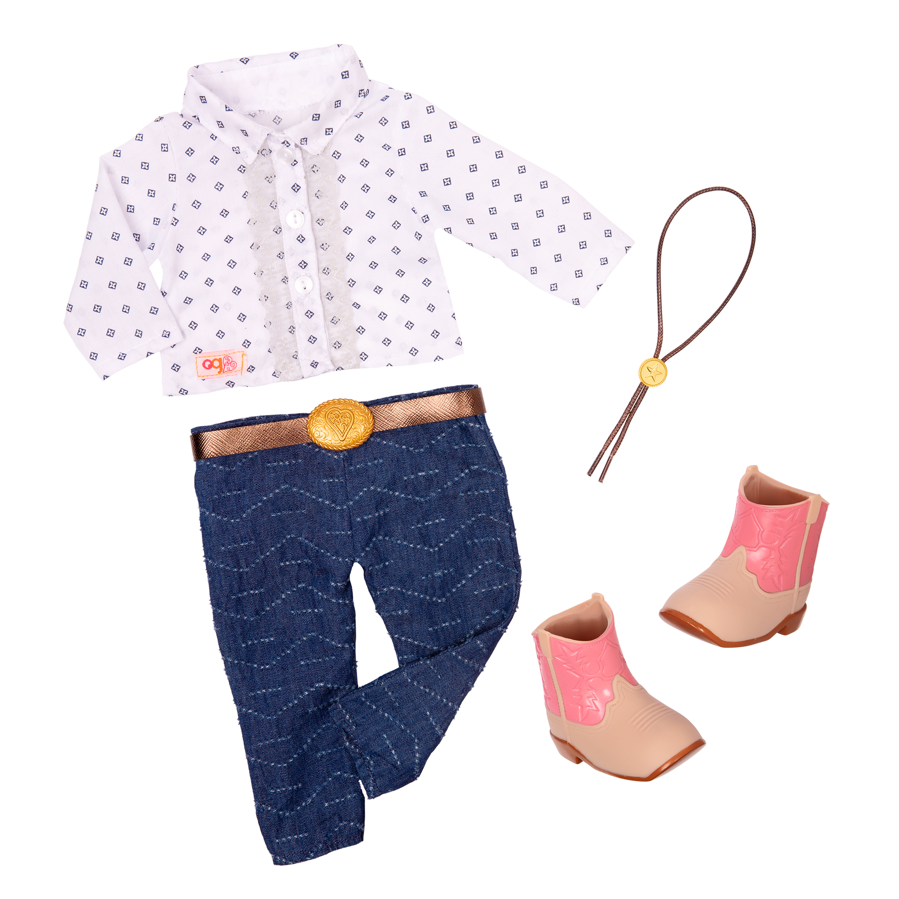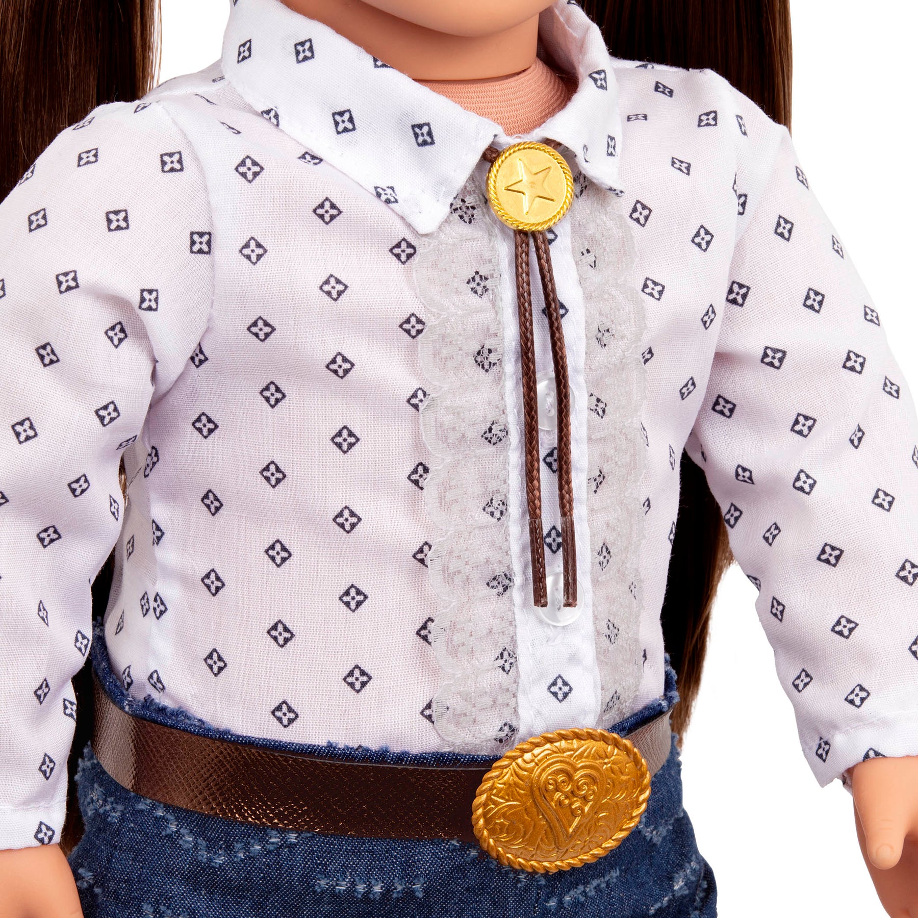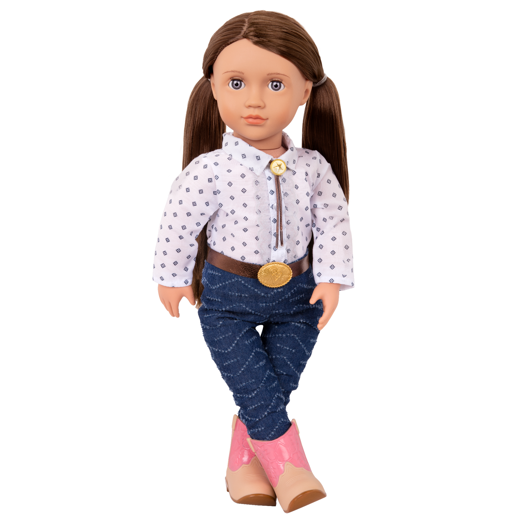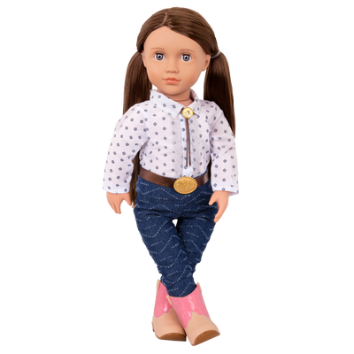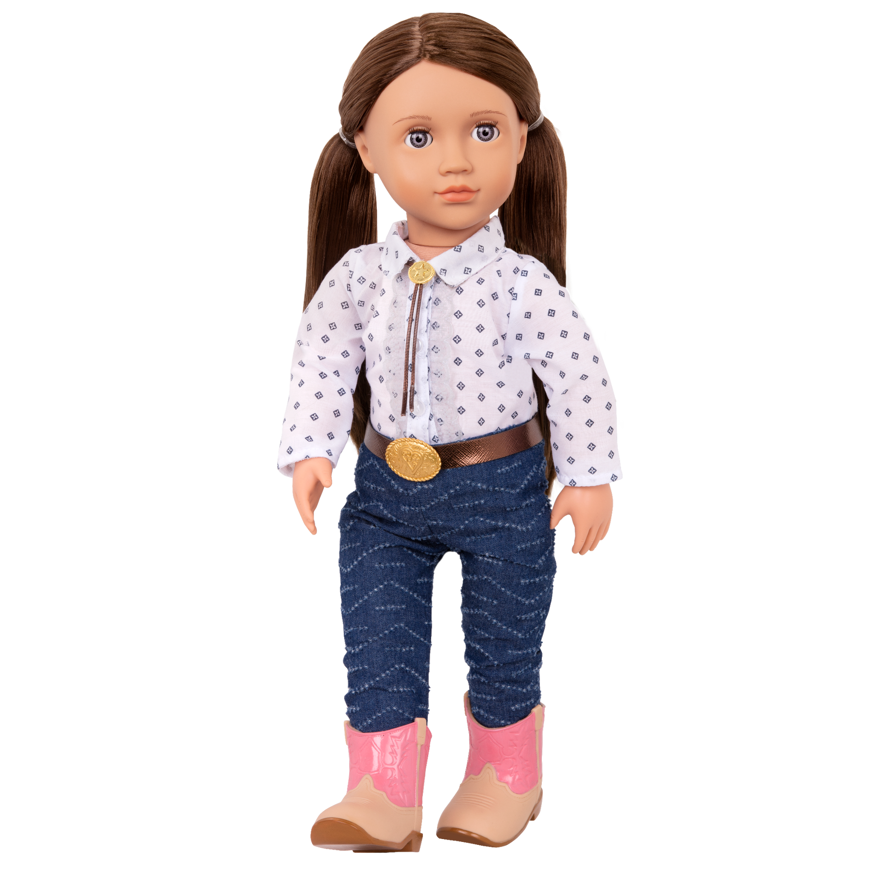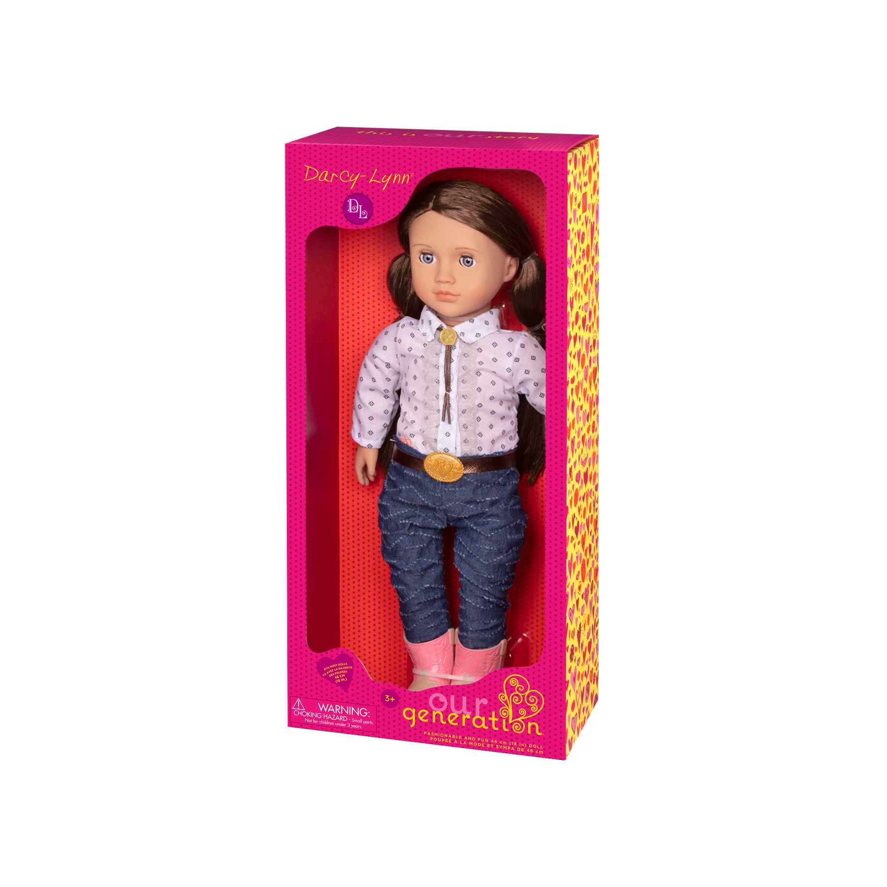 Ride into adventure with Our Generation doll Darcy-Lynn! This 18-inch equestrian doll has a huggable soft body and lifelike features that will delight doll fans during playtime. Her unique grey eyes open and close, and her long brown hair is fun to style in many ways! Darcy-Lynn loves all things Western. She's dressed in a stylish yet casual country outfit featuring a patterned button-up shirt with a gold-star bolo tie, and patterned jeans with a large golden belt buckle. No Western outfit would be complete without the signature cowgirl boots! Darcy-Lynn’s are pink and beige with a cute embossed pattern. When it's time for dress-up, her outfit has easy-open closures to quickly put on and remove. So you can mix, match, and create even more styles on any adventure! Our Generation dolls make a great gift for kids ages 3+ (small parts), encouraging them to imagine their own unique stories.