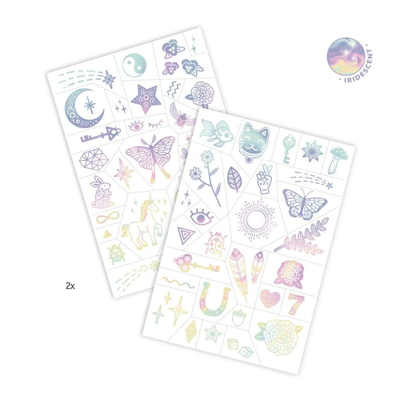 A collection of dermatologically tested tattoos with an iridescent finish. Features pretty and mystical designs.
