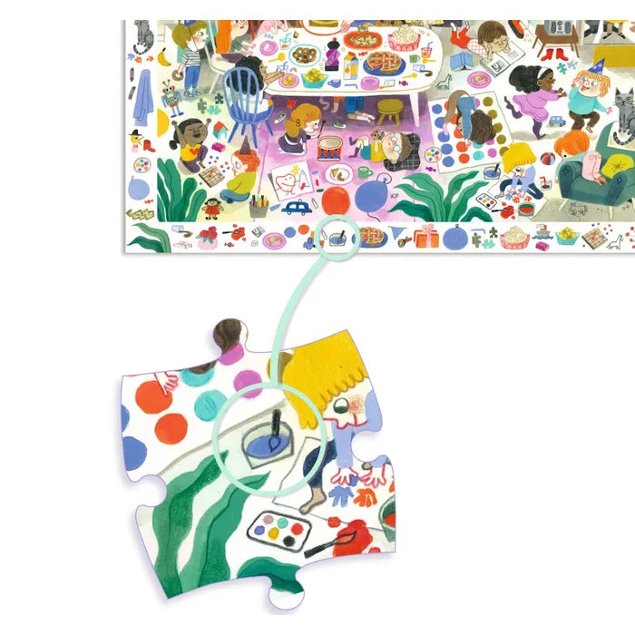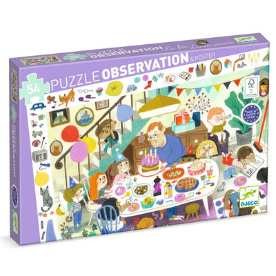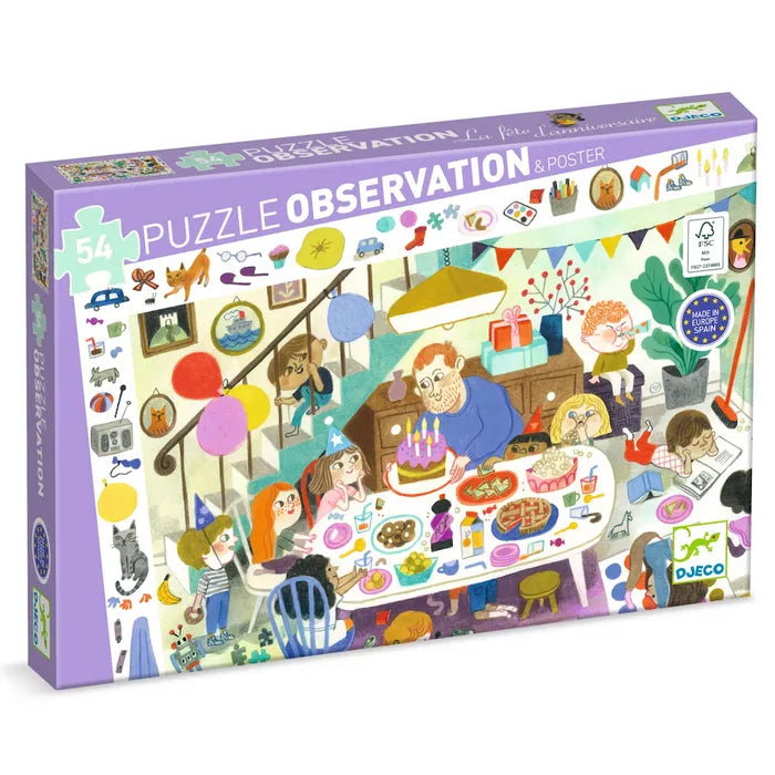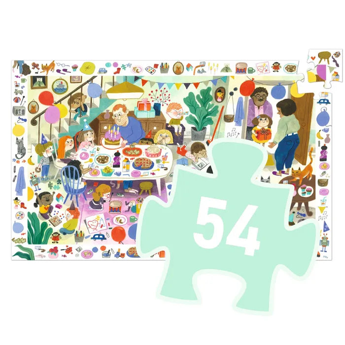 This puzzle consists of 54 pieces and depicts a birthday party. The set includes a puzzle-sized poster.
