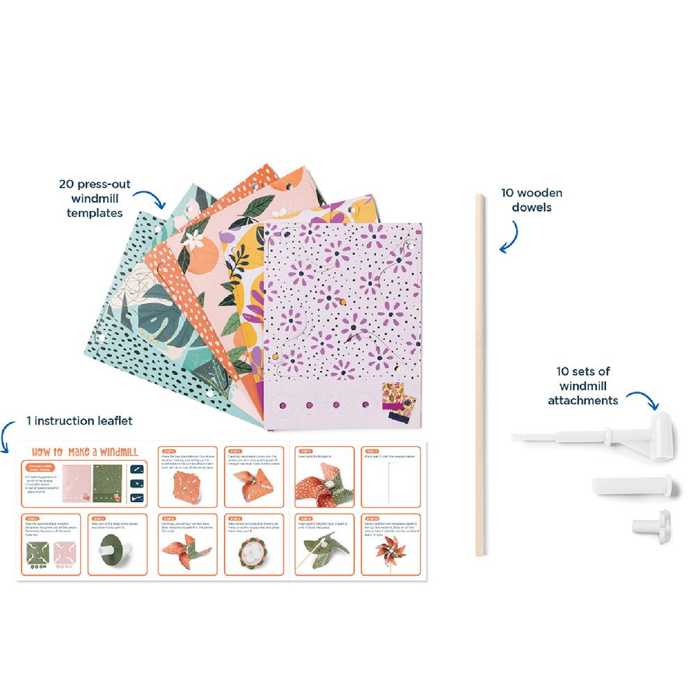 Create wonderful windmills with this creative craft set. Follow the simple instructions to press out and make three windmill creations to display and twirl. Let your creativity soar as you imagine, make and play.