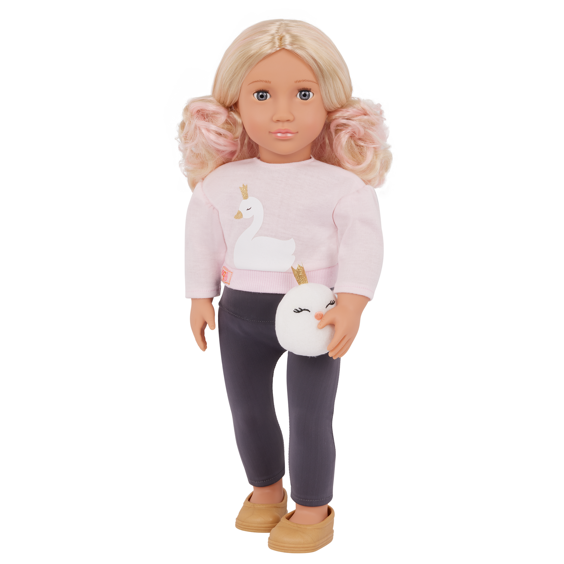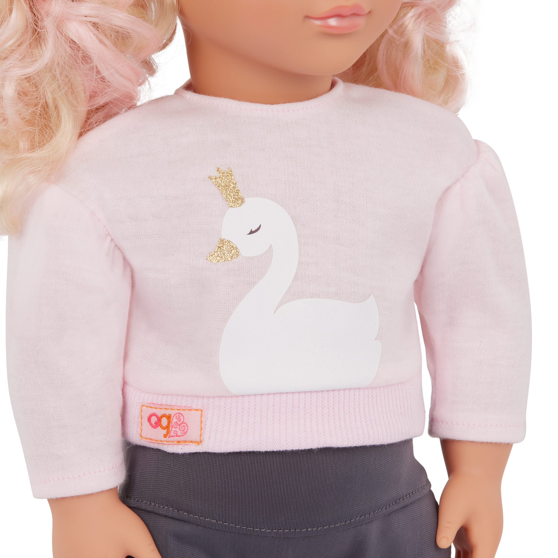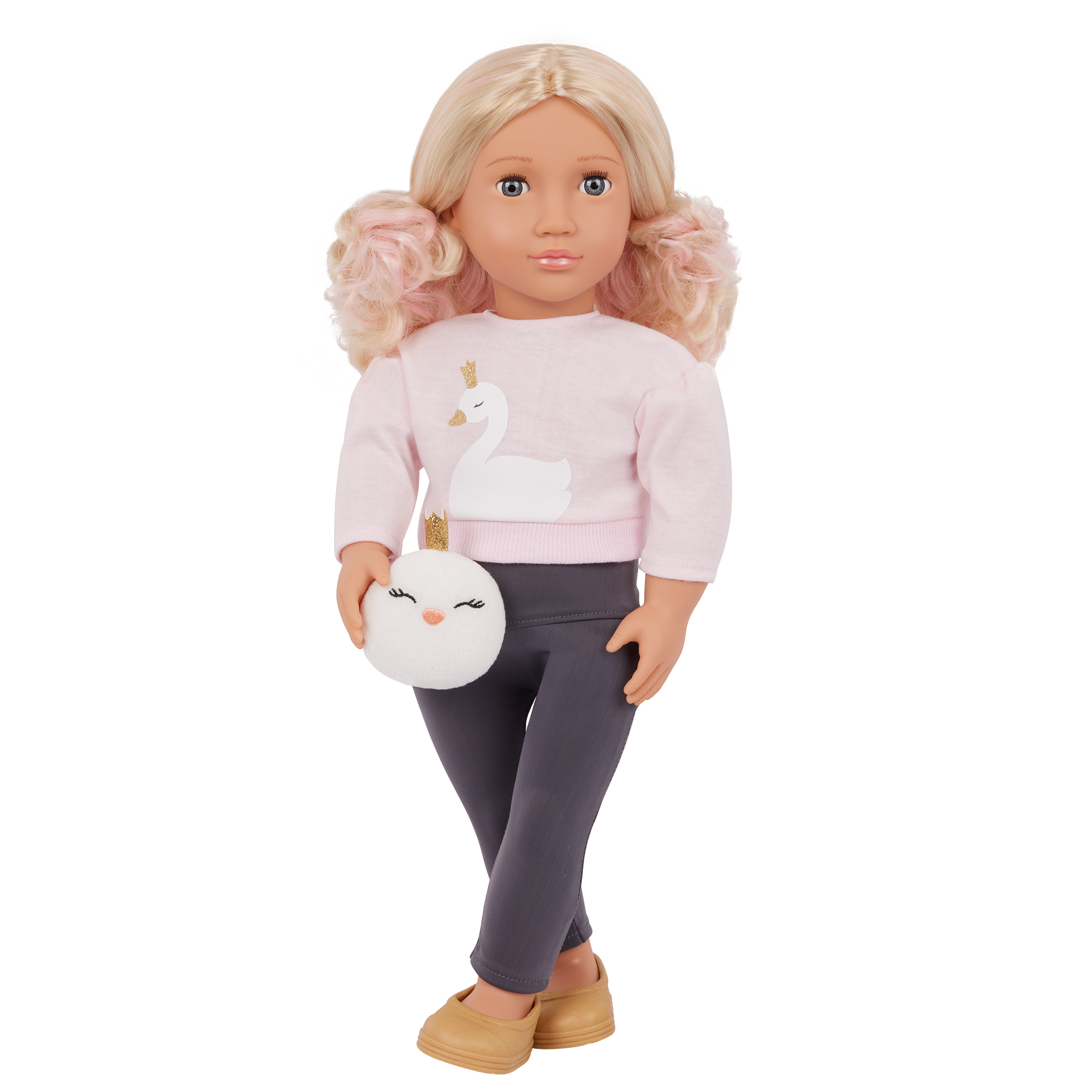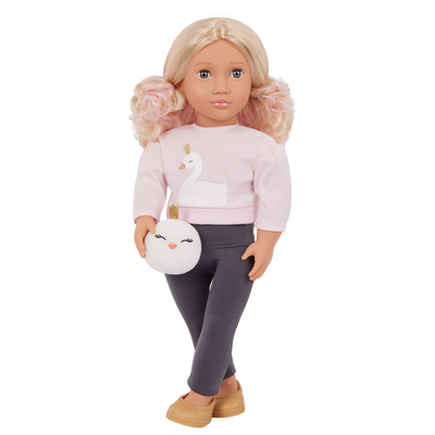 Fashion lovers and animal fans will have a swander-ful time styling Our Generation 18-inch doll Eliana! She has a huggable soft body and lifelike features. Her unique gray eyes open and close, and her long, wavy blonde hair is fun to style. Especially with her cotton candy pink peekaboo highlights! Eliana loves swans. And she lets it shine in her one-of-a-kind outfit. She arrives wearing a glittery swan-print sweatshirt with a pair of leggings and comes with a swan plush accessory. When it's time for dress-up, her outfit has easy-open closures to quickly put on and remove. So you can mix, match, and create more of your favorite looks!