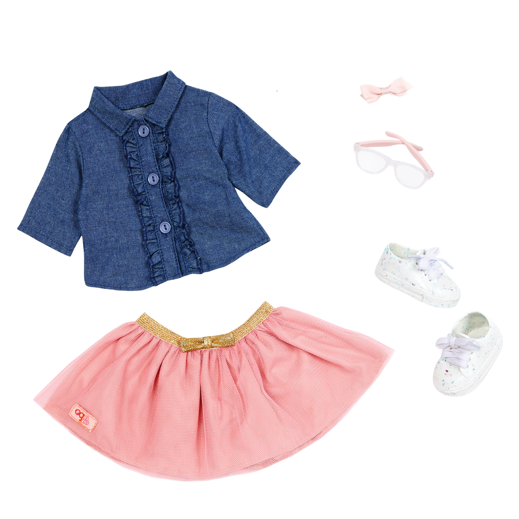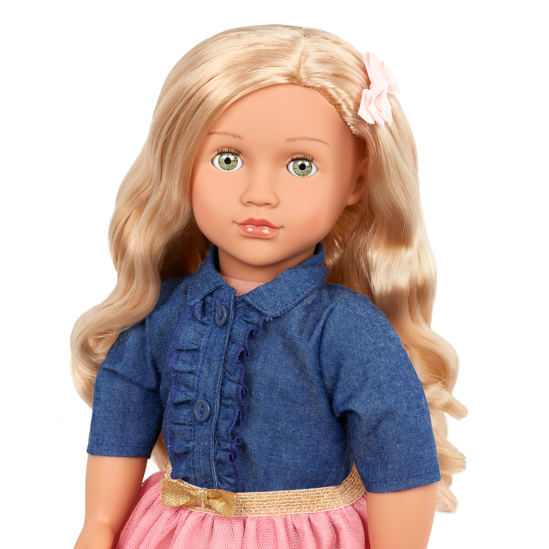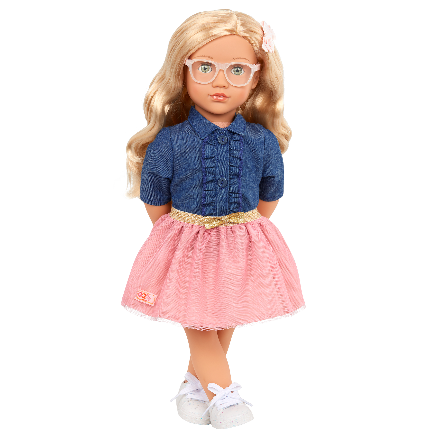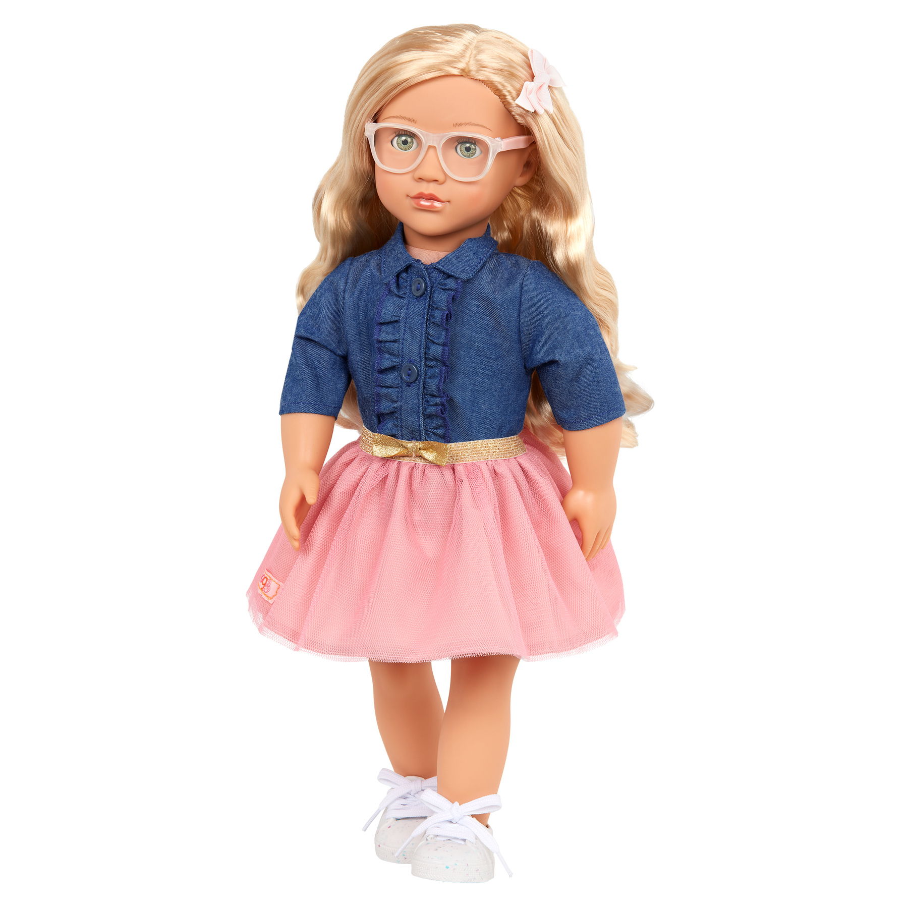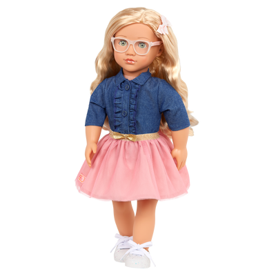 Party-ready and full of fun, Our Generation 18-inch doll Emily loves birthdays and surprise adventures! She has a cuddly soft body and realistically detailed features, from her bright green eyes that open and close to her long, wavy blonde hair that's fun to style! Emily arrives wearing a frilly denim-style top, a tulle skirt with a shimmering gold waistband, cute glasses, and a stylish hair bow. And her pair of running shoes feature real laces to tie! Her outfit also has easy-open closures to quickly put on and remove, so you can mix, match, and create more fun fashion looks!
