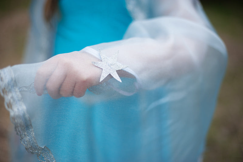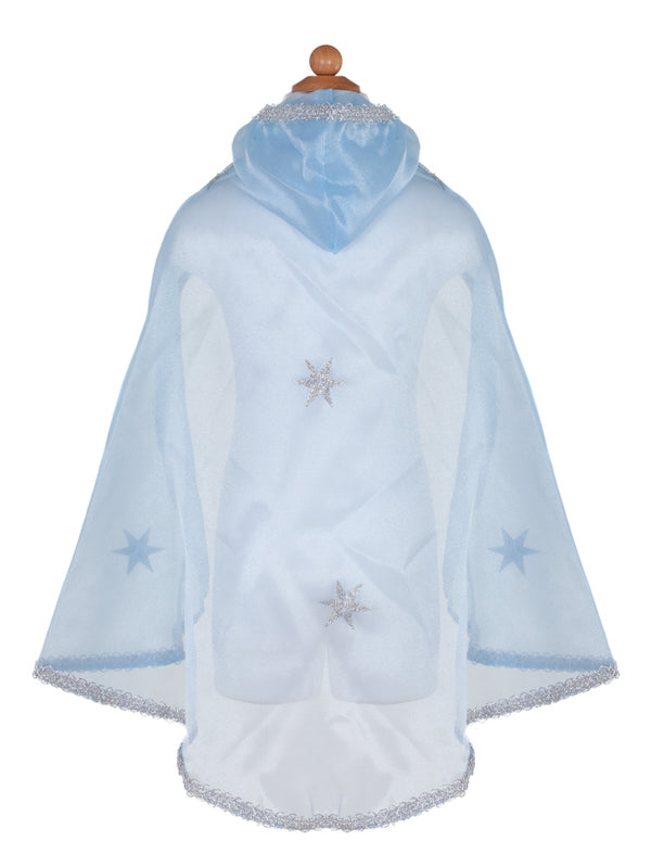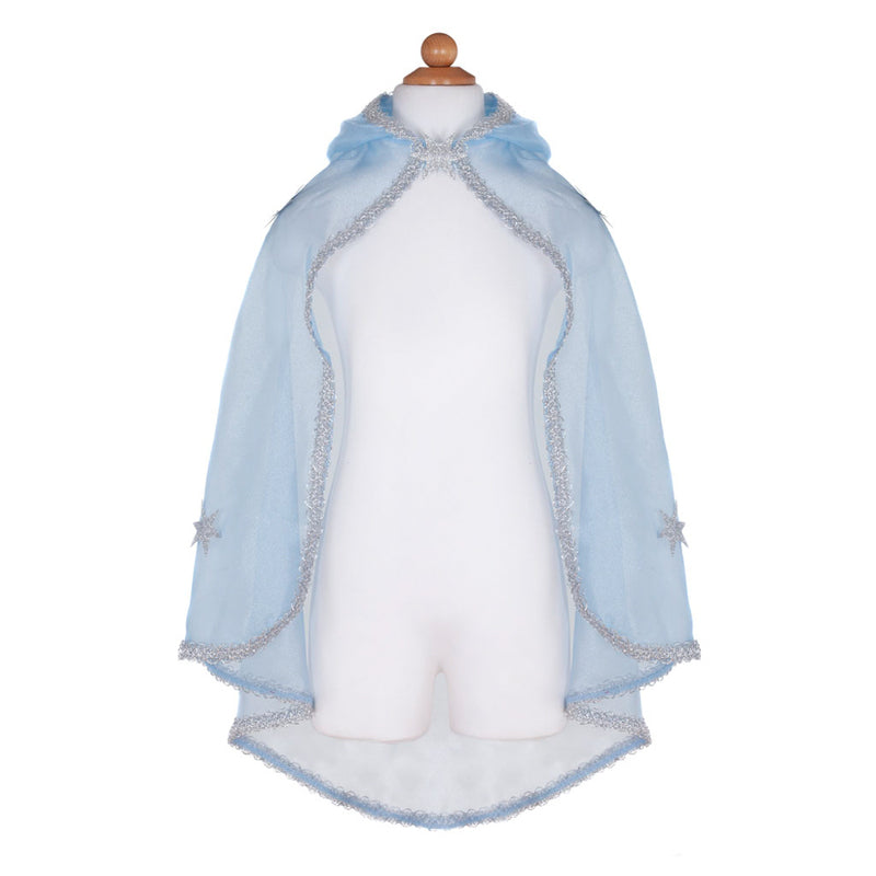 Cast icy spells with this classic snow queen cape. Crafted from blue crystal organza, this cape features silver glitter sparkle stars and a large hood. The entire cape is trimmed in silver braided trim for some extra added elegance.