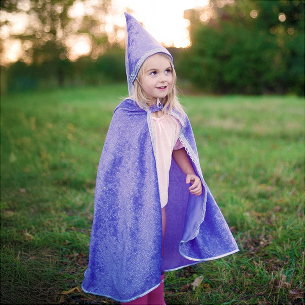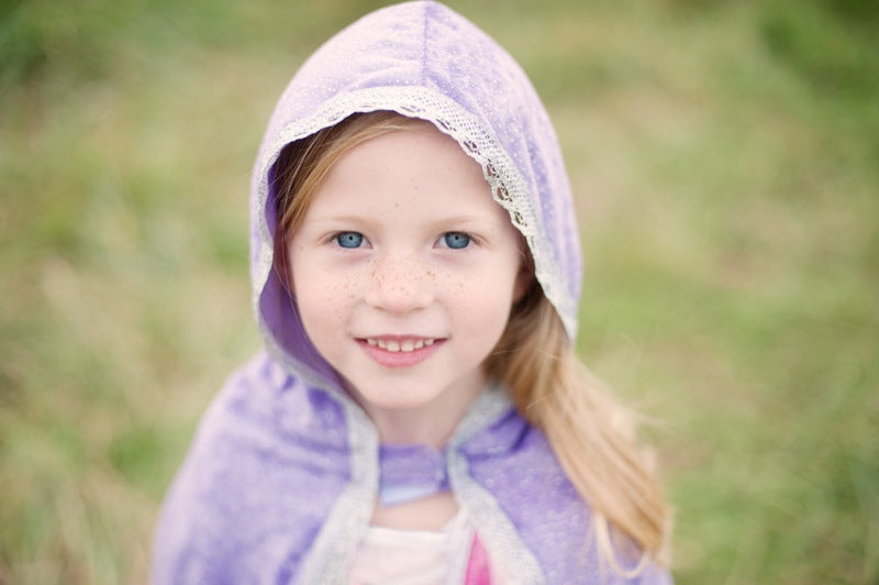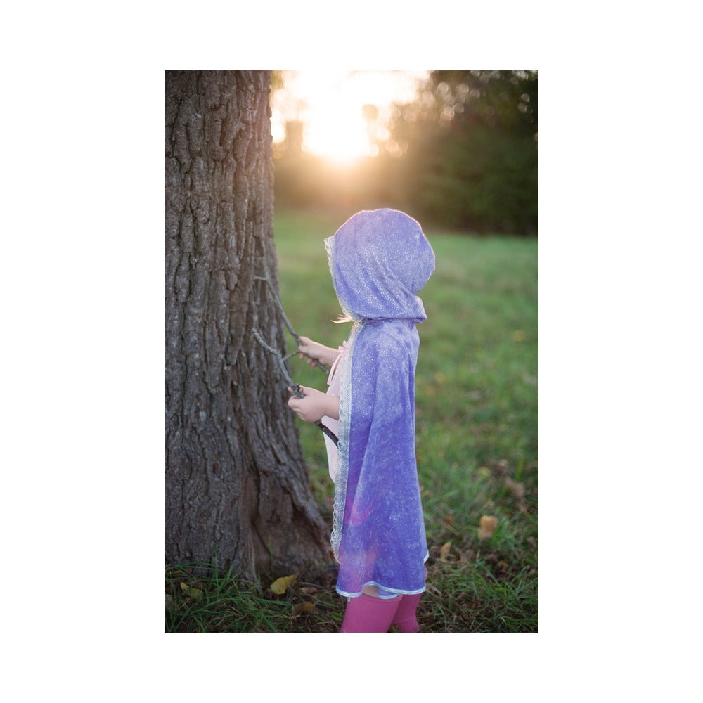 Little ones will love adding this stunning cape to finish off their dress-up. Crafted from lush velour that is printed with glittering diamond flecks and trimmed with metallic lace for even more shine. The hood is sized to drape and the neck fastens with a hoop & loop closure. Made with foil print sparkle so that there is no glitter shedding!