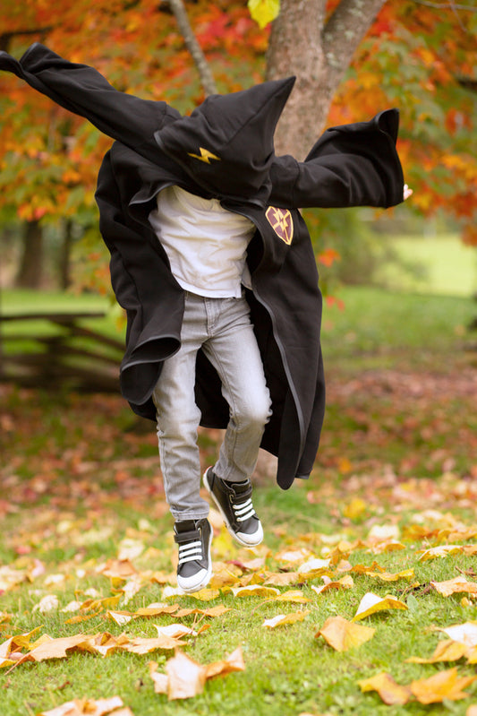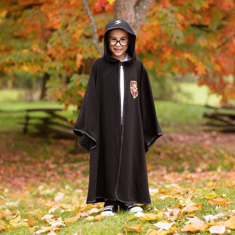 We have the perfect high-quality design wizard cloak made with soft black fabric. This hooded black robe is adorned with a crest and a lightning bolt on the hood, and it comes with a set of faux glasses!
