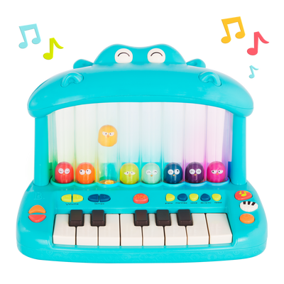 The fun never ends with a light-up piano and 8 popping bird friends! The Hippo Pop play piano from B. toys comes with a variety of funky features for little musicians to explore. Press the 8 white keys to see the birdies light up and pop up & down, listen and play along to 15 fun songs or 6 pre-recorded nursery rhymes, get silly with 26 wacky sounds, and choose from 5 different music modes – piano, marimba, voice, do-re-mi, or tweet! This keyboard for kids also includes a tempo button to speed things up or take it slow. Not to mention, this musical instrument comes with a handy volume button! And because we at B. keep the environment in mind, parents will also be happy to know that our packaging is 100% recyclable. 4 x AA batteries are required and included. Recommended for toddlers 12 months and over.