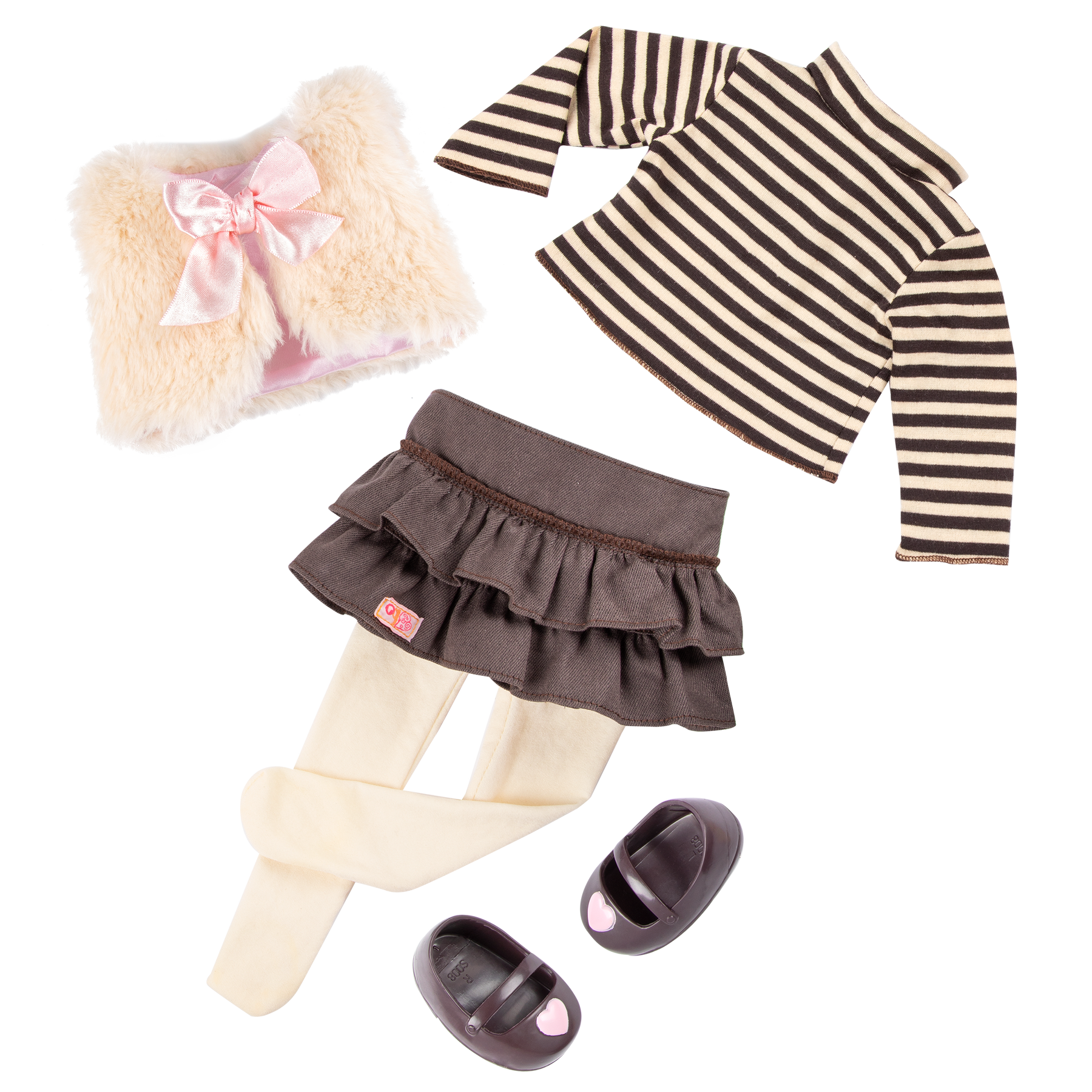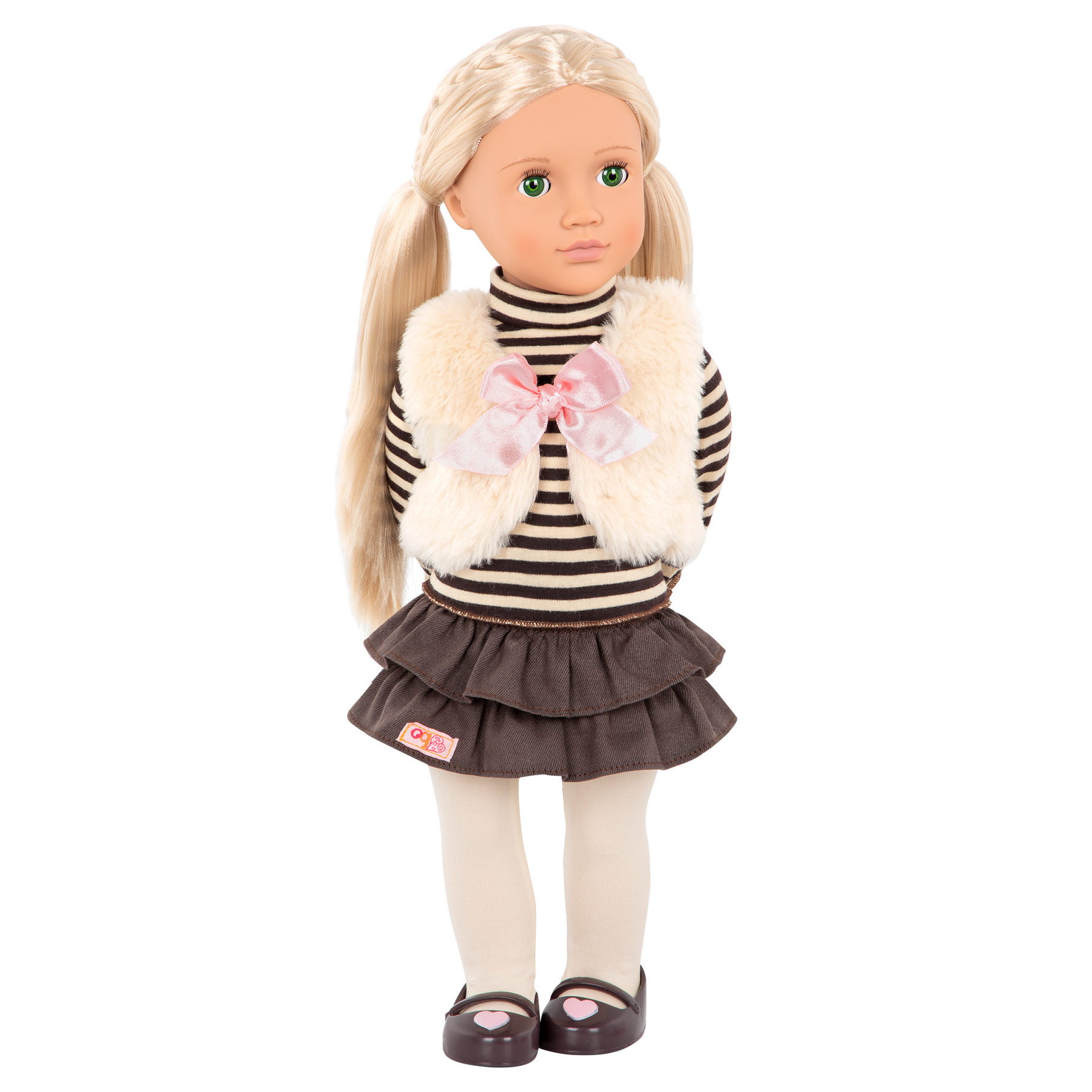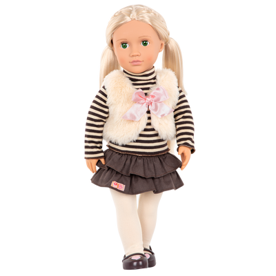 Dress up in fun and glamour with Holly! This Our Generation 18-inch doll has pretty green eyes that open and close, and her long blonde hair can be styled in different ways! Holly can rotate her neck, arms, and legs to easily change into stylish outfits, and she loves to spend her days out and about in the neighborhood! She is wearing her favorite outfit: a striped turtleneck, faux-fur chic vest, a ruffle skirt with comfy leggings, and matching shoes with a decorative heart design!