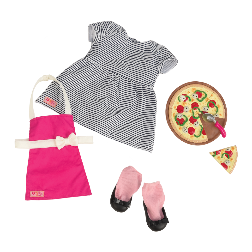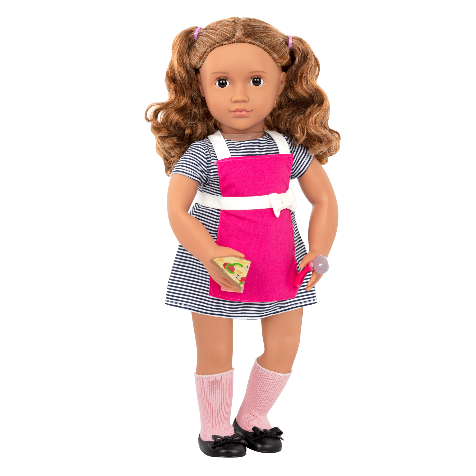 Fun is on the menu at the diner with Isa, a beautiful Our Generation 18-inch doll with long, wavy, light brown hair and warm-brown eyes that open and close. Isa comes with 2 complete outfits! Her waitress outfit includes a striped black and white dress, apron, and shoes, as well as a tray of 6 pizza slices to serve to her guests. For a different look, she comes with a long-sleeved turquoise T-shirt with a glittery heart print, blue denim jeggings, and a pair of roller skates! Create your own stories with this inspiring collection!