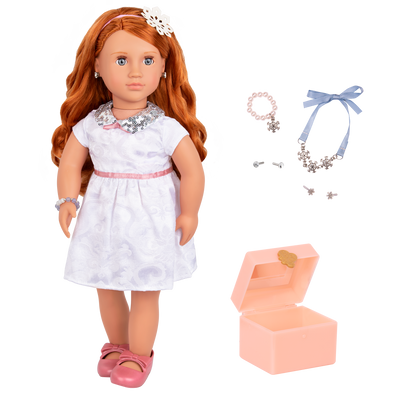 Start accessorizing with Julissa, the Our Generation 46cm jewelry doll with pierced ears! She has beautiful dark-blue eyes that open and close, and her long red hair is fun to brush and style! Julissa arrives with a sparkling, snowflake-themed jewelry collection that features 2 pearl bracelets, a snowflake necklace, and 6 studded earrings to mix and match with any look. And the pink jewelry box holds every dazzling piece to keep them neatly organized! Julissa can rotate her neck, arms, and legs to easily change into stylish outfits, and the easy-open closures on her dress make it quick to put on and remove, so Julissa can try on other colourful clothes just as much as she tries on her jewelry! (Additional outfits sold separately)