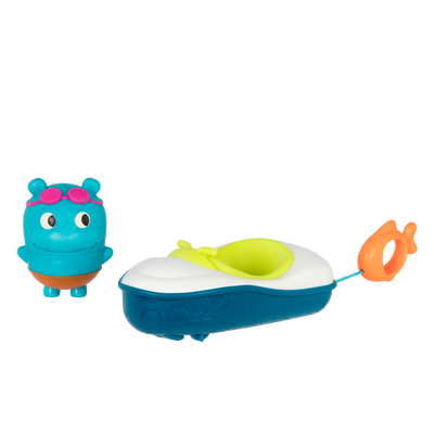 Make waves in the bath with the Pull & Go Rider from B. toys! Watch Sunny the hippo zoom here and splash there by simply pulling on the little fish – this toy jet-ski is totally kid-powered! If you want to switch it up, you can easily pop Sunny out of the bath boat and fill this little swimmer up with water to ensure the splashiest experience. When the water is warm, this happy hippo’s swimsuit color magically changes right before your eyes! To make this aquatic experience that much more exciting, collect the other animal bath squirts from our Squish & Splash sets – they fit in the jet-ski (sold separately)! Recommended for children 10 months and over.