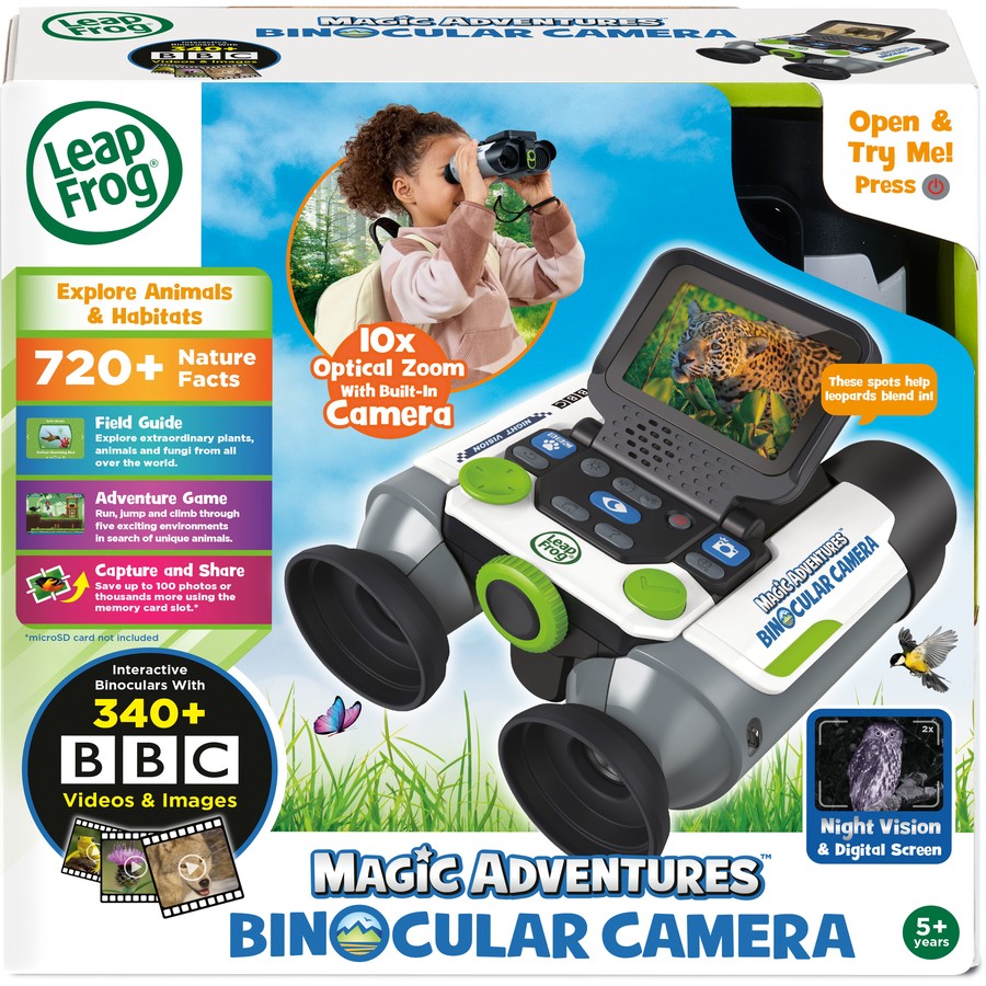 - Focus on nature around you using these real binoculars and camera with 2.4” video screen for easy viewing; navigate habitats in search of animals in an exciting adventure game