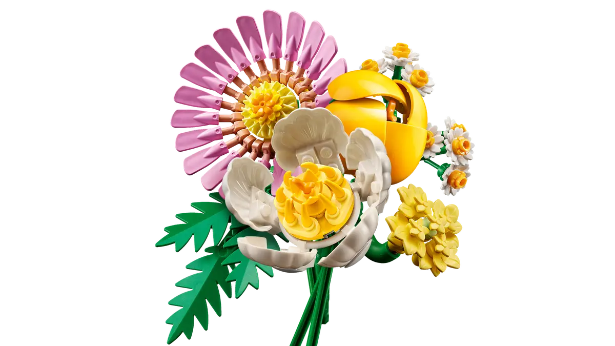 - LEGO® flowers – The bouquet blooms with 6 species of spring flowers in pastel shades, including Billy buttons, bluebells, Cleopatra ferns, yellow yarrows, a gerbera, a peony and a tulip