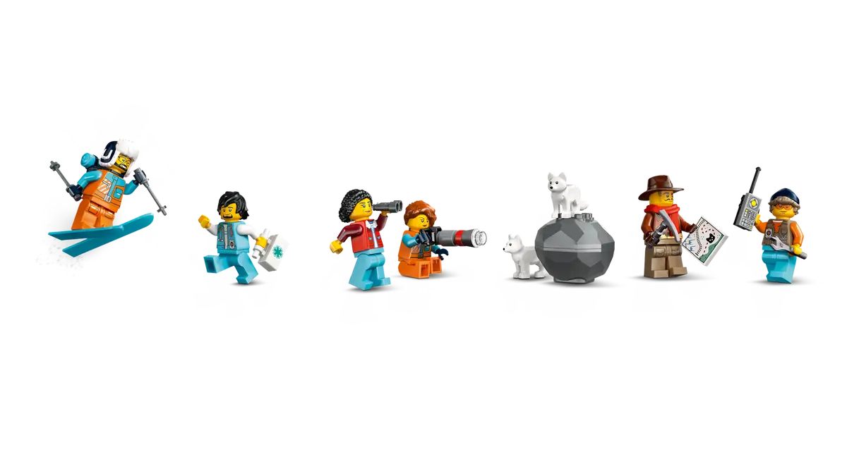 - Features and functions – Kids can drive the toy train through the mountain tunnel to activate a rockfall function and send minifigures down a zip line that connects the mountain to the Arctic outpost