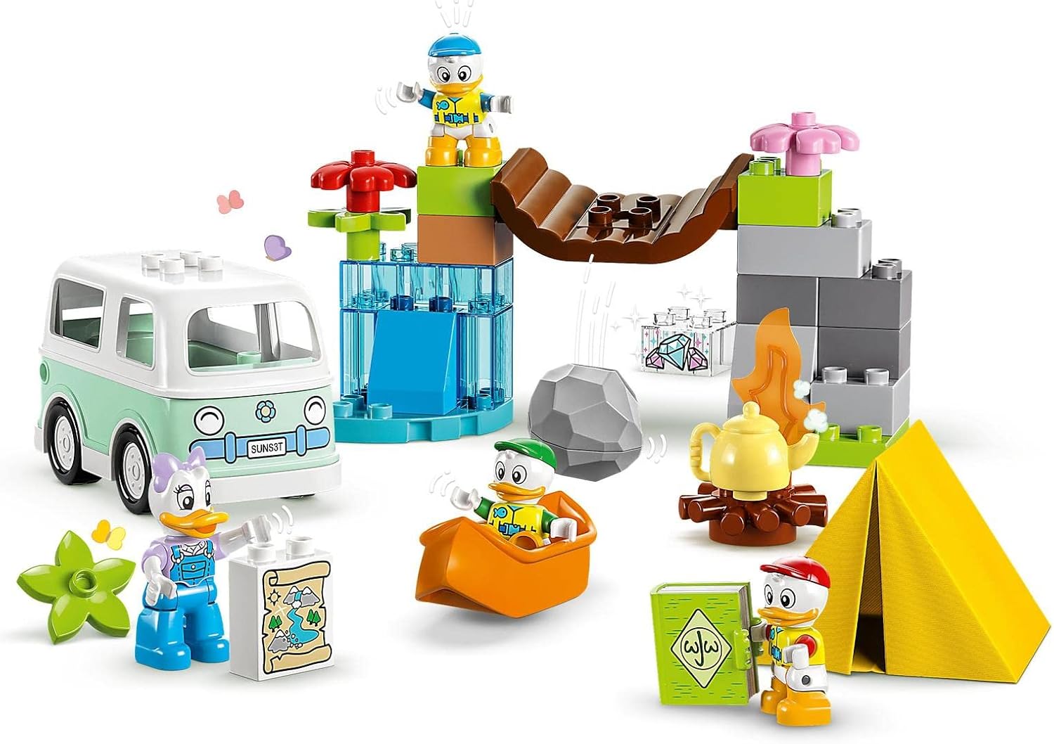 Packed with creative activities, this fun construction toy helps toddlers aged 2+ learn about resilience and teamwork as they join Disney’s Daisy Duck and her nephews on an action-filled camping trip. Buildable playset to grow imaginations Toddlers set off on an outdoor adventure with Daisy Duck and Huey, Dewey and Louie in a drivable camper van. They find a treasure map and navigate the river in their canoe, past the wobbly bridge that threatens to tip a boulder into the water. They discover the treasure behind the buildable waterfall toy, then make a campfire and snuggle up in the tent. Learning lifelong skills Toddlers develop their fine motor skills building this educational construction toy. Playing out family scenes helps kids learn empathy, self-expression and collaboration, developmental milestones parents can share as they join in the action-packed play.