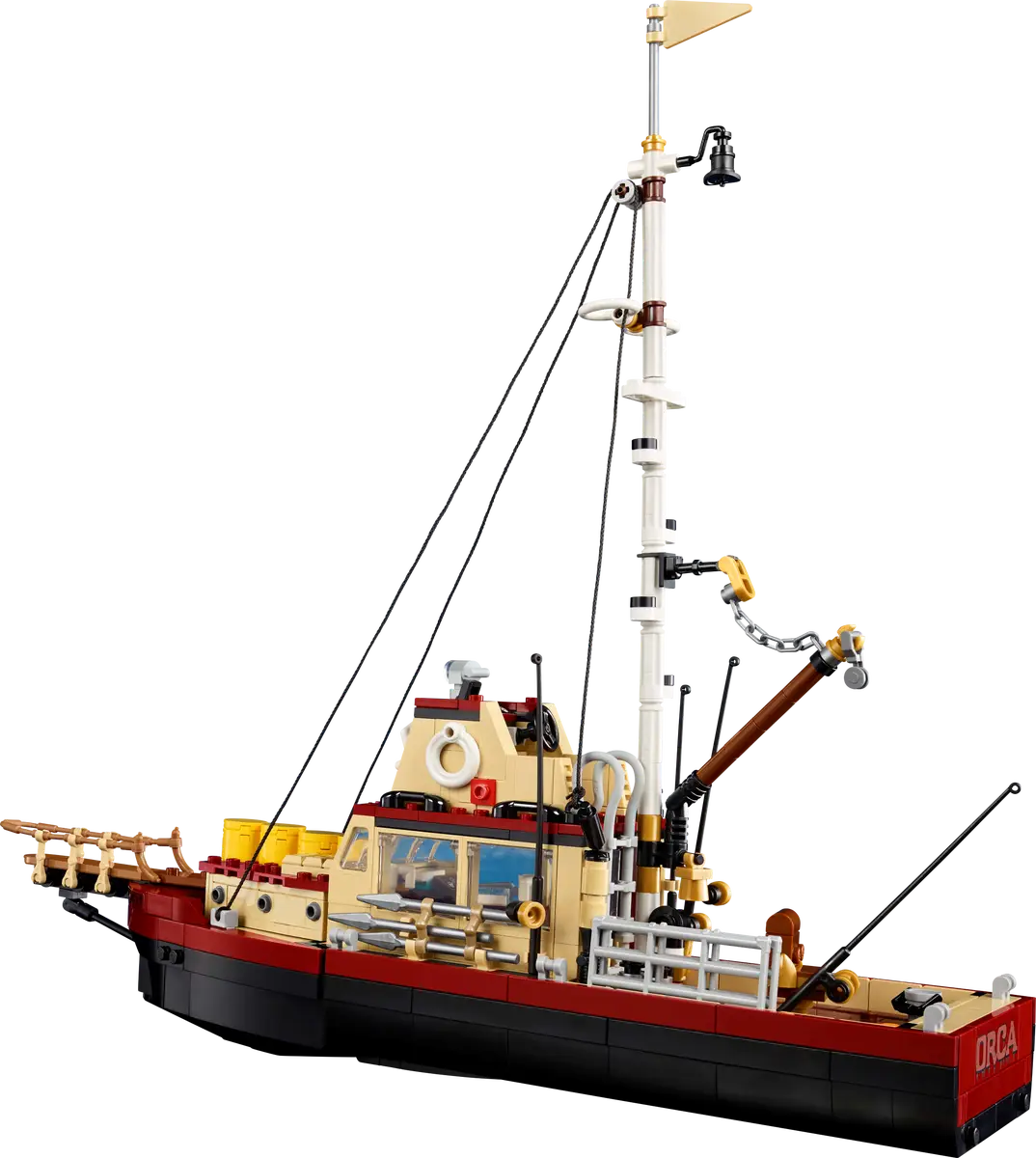 - LEGO® boat and brick-built seawater base – The Orca boat model features a cabin with a removable roof for easy viewing of the interior details, an adjustable boom and rigging, plus iconic accessories