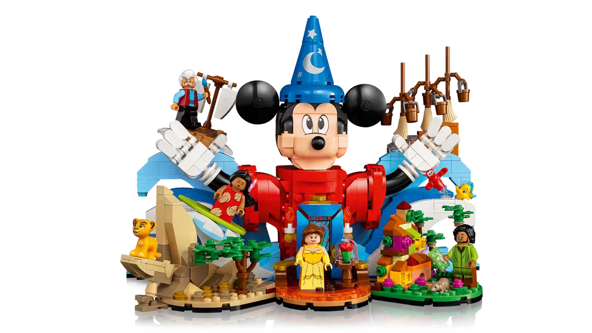 With Mickey Mouse in his sorcerer’s apprentice outfit at the centre, this collectible model showcases many popular Disney characters and includes the first-ever LEGO minifigure of Belle from Beauty and the Beast with the enchanted rose. Other vignettes include Geppetto on a raft in Pinocchio, Lilo surfing in Lilo & Stitch, Simba atop Pride Rock in The Lion King, Bruno at Madrigal House in Encanto, the magic Brooms carrying water in Fantasia and Sebastian the crab and Flounder the fish in The Little Mermaid.