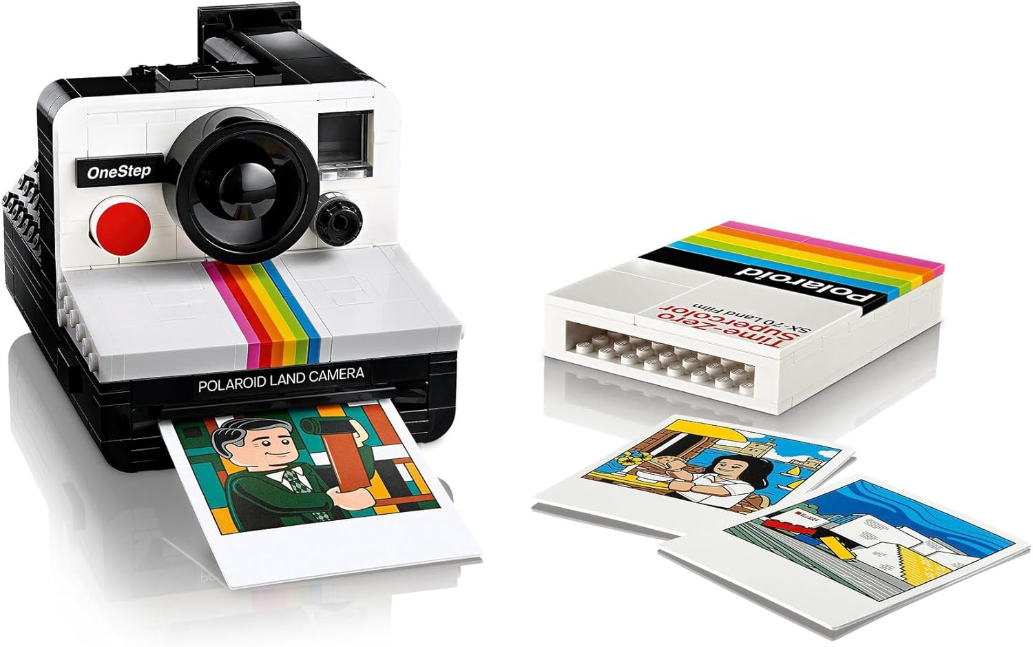 Enjoy quality time capturing iconic details such as the viewfinder, Color Spectrum and exposure compensation dial, and add stickers with authentic graphics. Build a Polaroid Time-Zero Supercolor SX-70 Land Film pack containing 3 illustrated ‘photos’, including one of Polaroid inventor Edwin H. Land. Choose a photo, load it into the camera, press the red shutter button and the photo is ejected, just like the real thing.