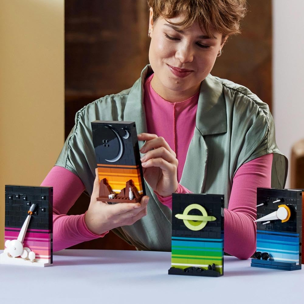 Turn off your thrusters and let your mind drift into space with this LEGO® Ideas Tales of the Space Age (21340) building set. It features 4 connectable brick-built 3D postcards, each depicting scenes inspired by 1980s sci-fi myths, films, books and posters. Create cool minimalist LEGO brick representations of an observatory for viewing comets and shooting stars, a moon base and lunar eclipse, a shuttle blasting through space, and a black hole.