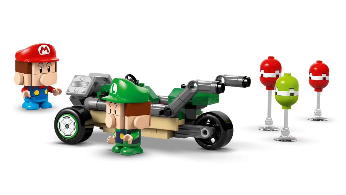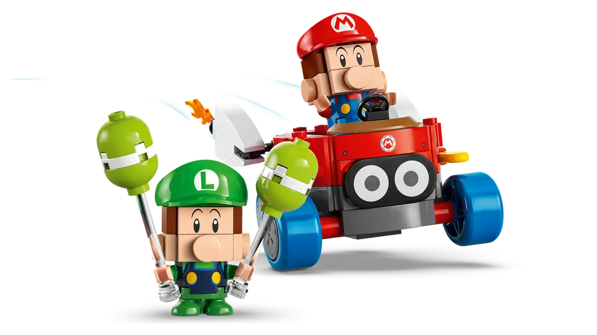 - Brick-built Mario Kart™ set – Join forces with Baby Mario or Baby Luigi for balloon-busting battles and racing action with this LEGO® Super Mario™ adventure toy playset