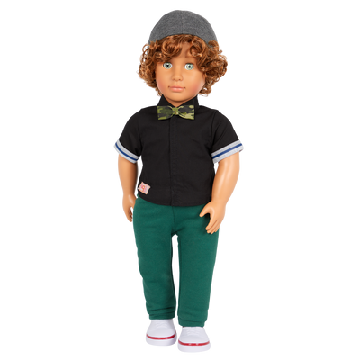 Explore cool and playful styles with Lorenz - he loves pairing his outfits with fun accessories! This Our Generation 18-inch boy doll arrives wearing a stylish top, a pair of joggers, running shoes, a beanie hat, and a camo-themed bowtie for an extra classy look. He has a huggable soft body with lifelike features, from his light-blue eyes that open and close to his medium-length, wavy brown hair that's fun to style! When it's time for dress-up, his outfit has easy-open closures to quickly put on and remove, so you can mix, match, and give Lorenz more fun looks on every adventure!