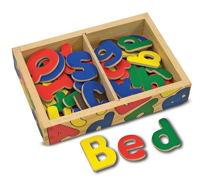 52 magnetic uppercase and lowercase letters make a colorful jumble of possibilities in their handy wooden case. Ideal for letter recognition, matching, and stenciling, these must-have letters spell learning fun"!"