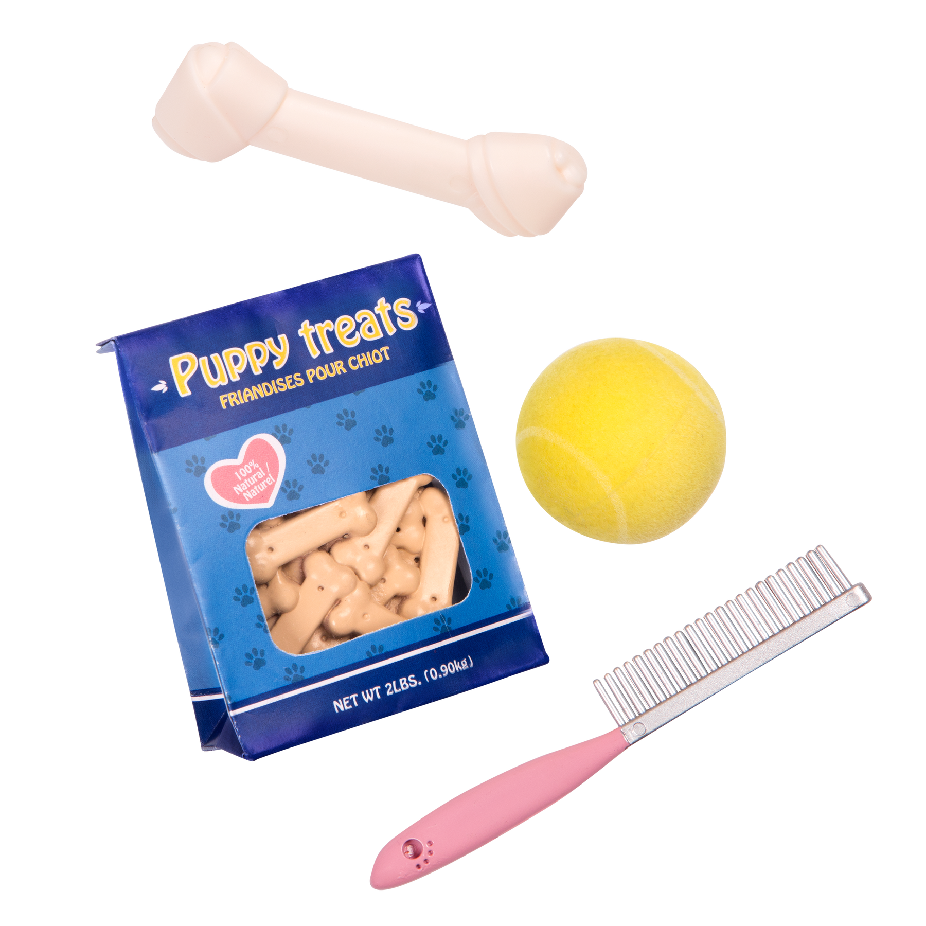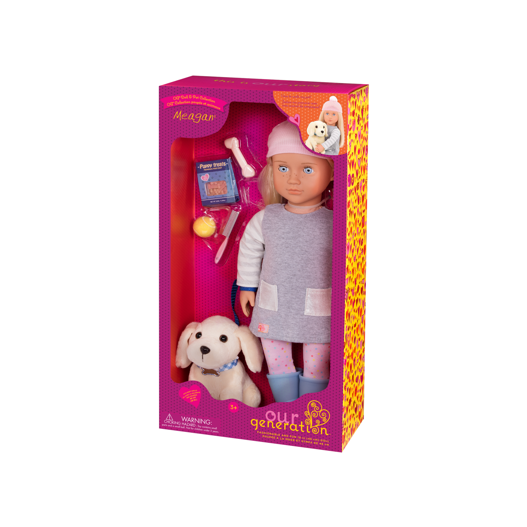 Create golden memories with Our Generation doll Meagan and her very own Golden Retriever! This 18-inch doll is a dog adorer. She loves to keep her pet's hair groomed with her comb and enjoys handing out treats when someone is being a good boy! Meagan has unique, gray-blue eyes that open and close, adorable freckles, and long blonde hair that's fun to style. She arrives wearing a warm gray sweater dress with two pockets in the front, polka-dotted leggings, and a matching pom pom hat to walk her furry friend in style. She even has blue rain boots in case it starts to drizzle outside!