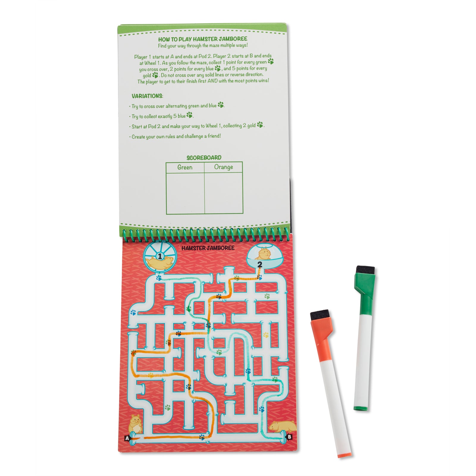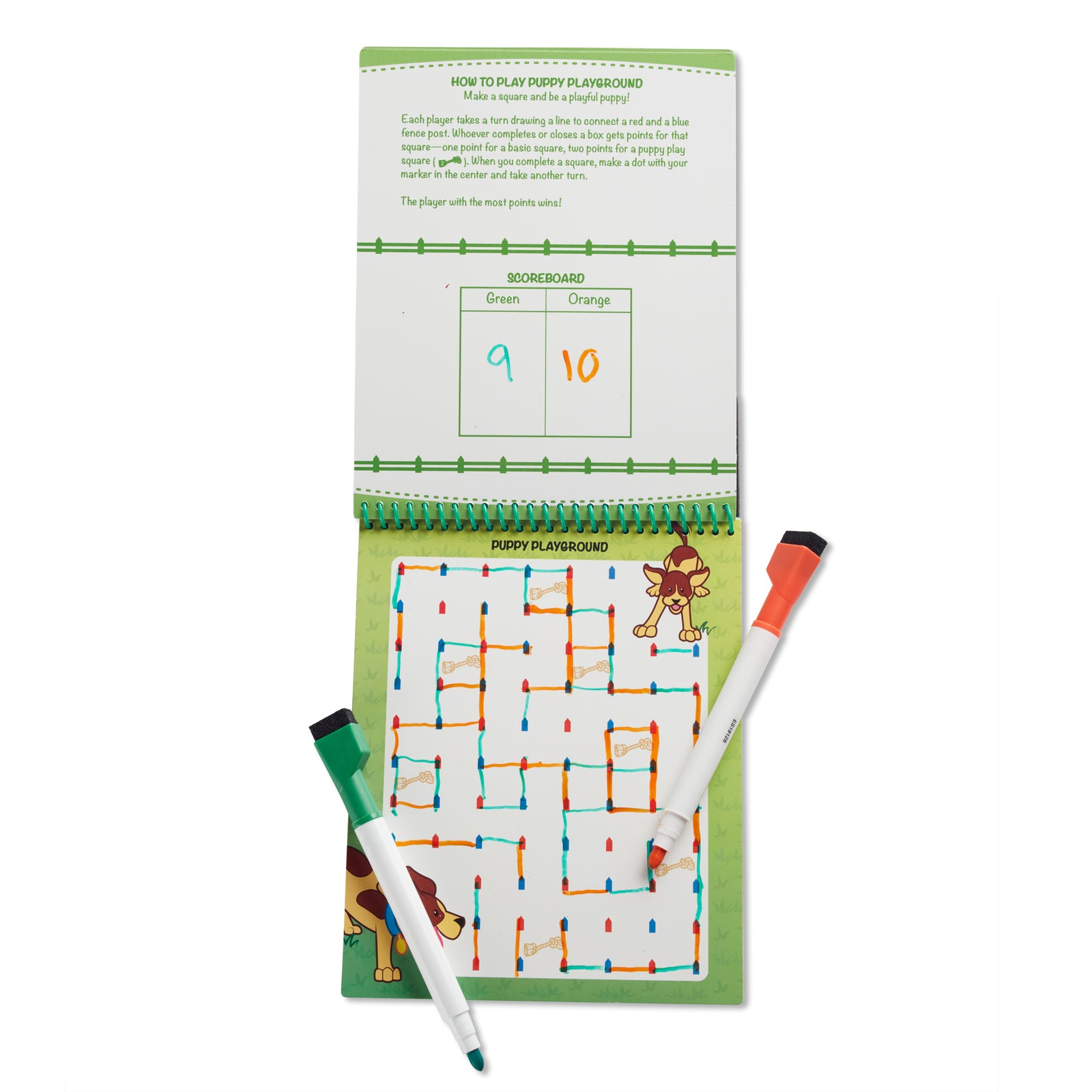 Take fun on the go with this "re-markable" take-anywhere book of dry-erase marker animal-themed games! Choose from 17 different wordplay, picture, and creative animal brain games for one or two players, including classics like mazes and I-spy, as well as games that are sure to become new favorite challenges, like Pet Name Creator and Puppy Playground. Two included dry-erase markers with built-in eraser caps store conveniently in the cover of the spiral-bound book, making it a perfect travel activity for kids six and older. It's easy to write on, erase, then play again!