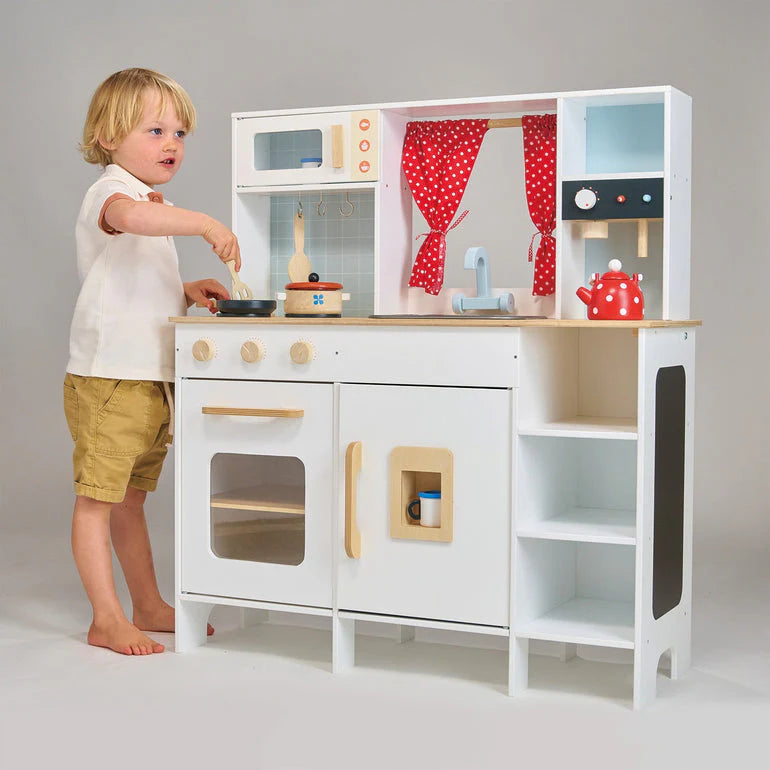 Children can use their imaginations through role play at their very own pretty kitchen station with window and curtains by cooking dinner for their friends, boiling the kettle, making a cup of coffee, washing up in the sink, using the microwave to heat up food, baking a cake in the oven and putting their play food away in the fridge. Check out the ice dispenser in the front door of the fridge. Set includes 2 cups, a wooden spoon and a dotty kettle.