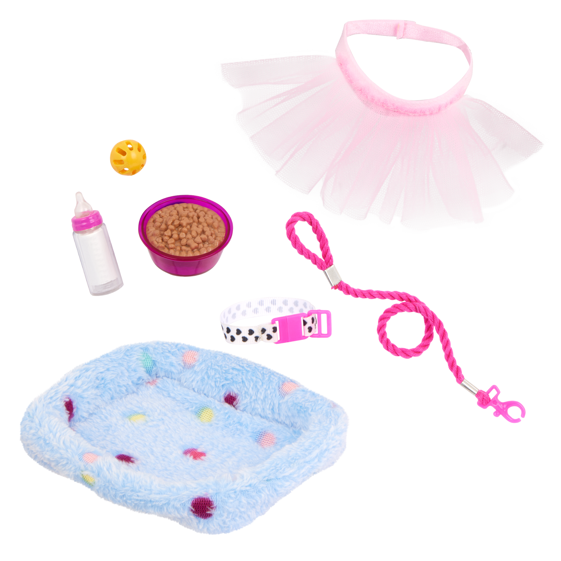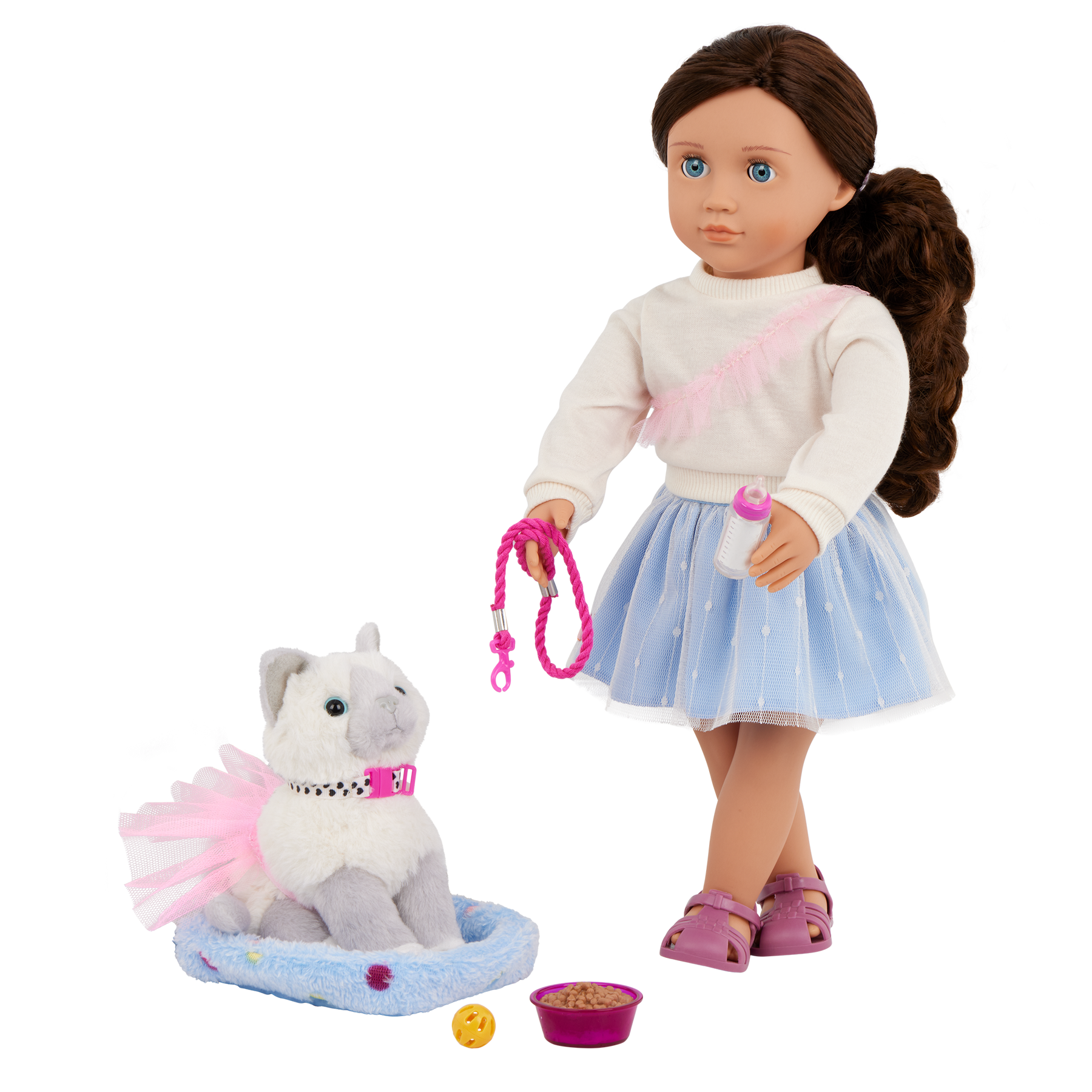 Our Generation doll Mindy and her pet kitty Pepper spark friendship and fun for animal fans! This 18-inch doll has a huggable soft body and lifelike features to delight doll fans during playtime. She has bright blue eyes that open and close with long, wavy brown hair to style in many ways. Kids can explore fun adventures with Mindy's 6-inch kitten, Pepper. Plus, they can care for this furry friend and keep her stylish with bonus play pieces like a tutu, a collar, a leash, a ball, a bowl of food, a bottle of milk, and a bed! Mindy wears a top with a pink tulle applique and a pleated skirt that kids can mix and match with other Our Generation doll clothes to create more cute combos. Makes a great gift for kids ages 3 years old and up, encouraging them to imagine their own unique stories.