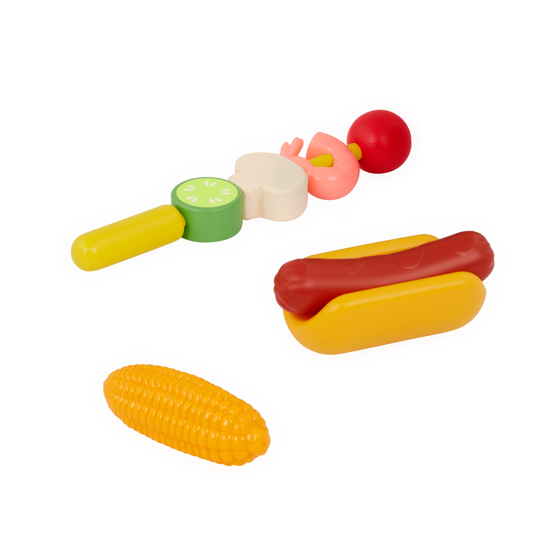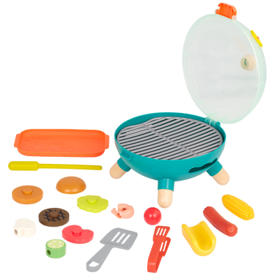 Burger? Hot dog? Veggies? Grill it all with the Mini Chef - BBQ Grill Playset from B. toys! This 18-piece set has everything mini grill masters need for a make-believe barbecue. Kids can put the meats and veggies on the grate and grill ‘em with the spatula and tongs. When the food is ready to serve, little chefs can then stack up a burger with the buns, a meat patty, a piece of lettuce, and a slice of tomato. They can also assemble a hot dog or a colorful skewer using a little shrimp, a cherry tomato, a mushroom, and a piece of zucchini. And when the pretend backyard barbecue is over, children can easily store all of the pieces in the set right inside the BBQ grill. With these colorful and tiny hands-friendly food toys, kids can cook up tons of sizzlin’ dishes! Discover the full Mini Chef collection from B. toys to find more role-play sets for the little chef in your life. Recommended for children 3 years and older.