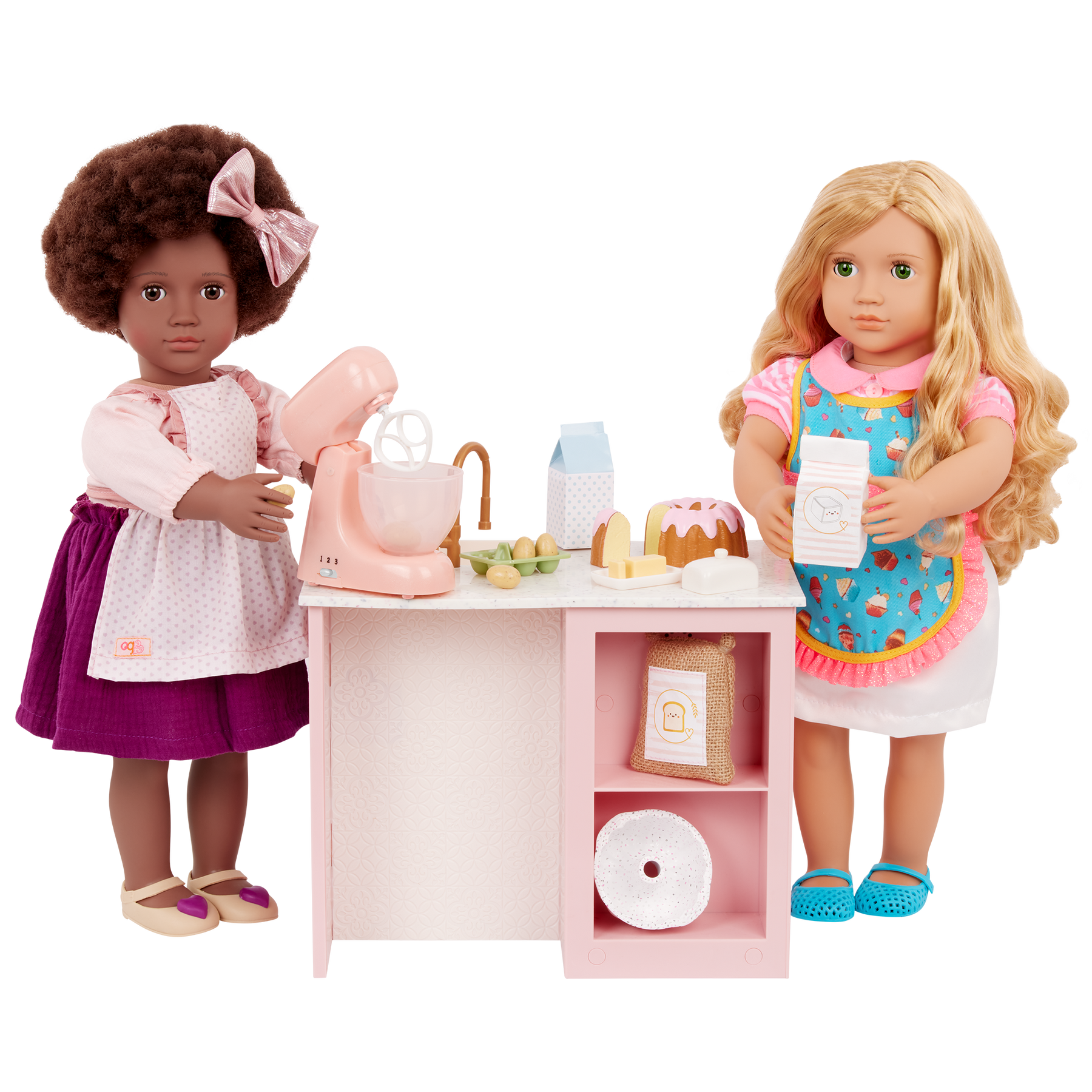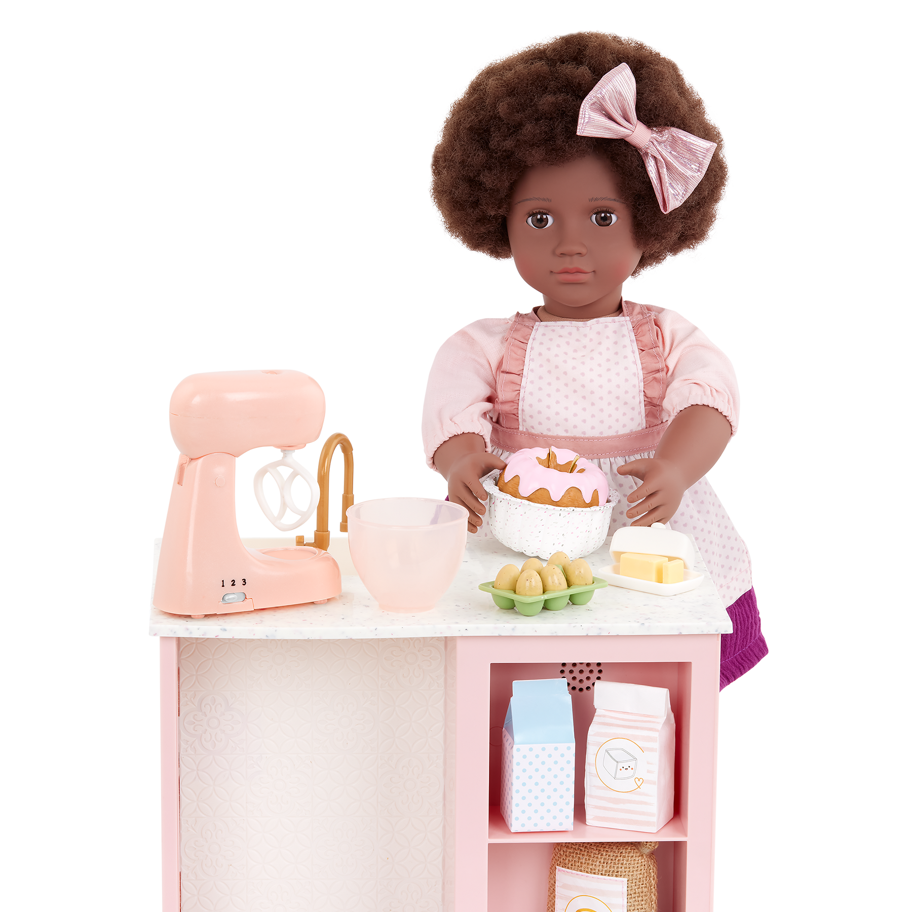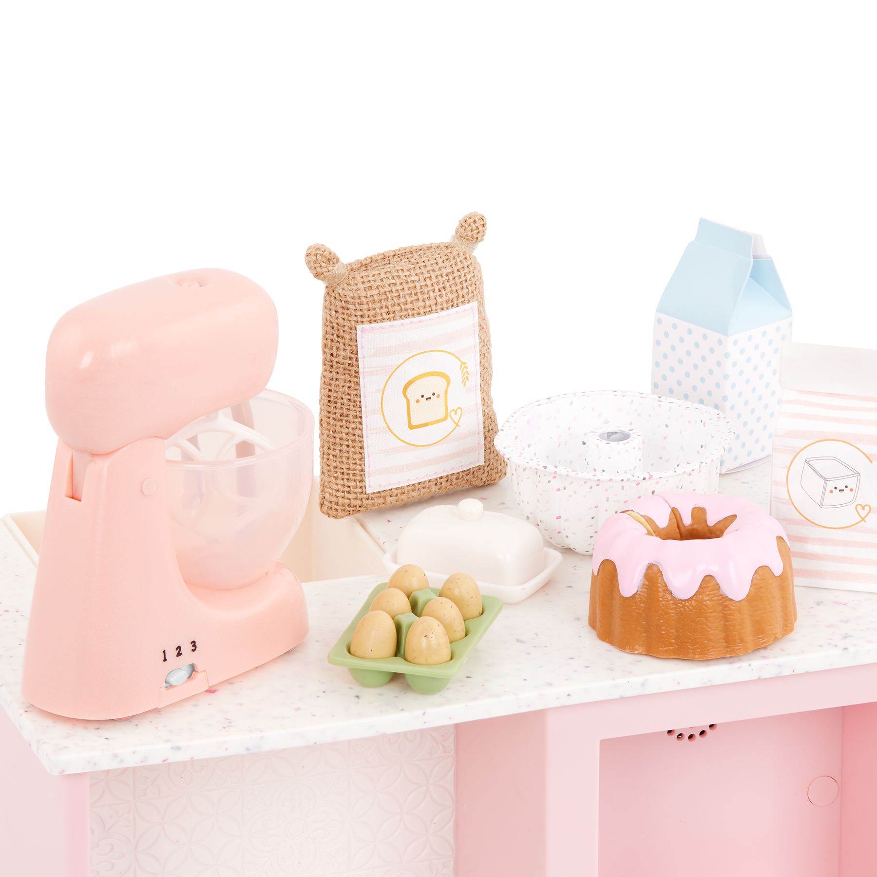 Baking treats is as easy as 1, 2, 3 with the Our Generation Mix it Up set for 18-inch dolls! These baking accessories have all the ingredients for little chefs to prep their favorite desserts, including a 3-speed mixer that really spins! Add the milk, butter, sugar, eggs, and flour into the mixing bowl. Then blend them all together to create a delicious Bundt cake (or anything you can imagine!). The Our Generation Mix it Up set is perfectly sized to pair with other doll kitchen sets for more pretend play cooking fun. And it's compatible with most 18-inch dolls and play food accessories. Dolls sold separately.