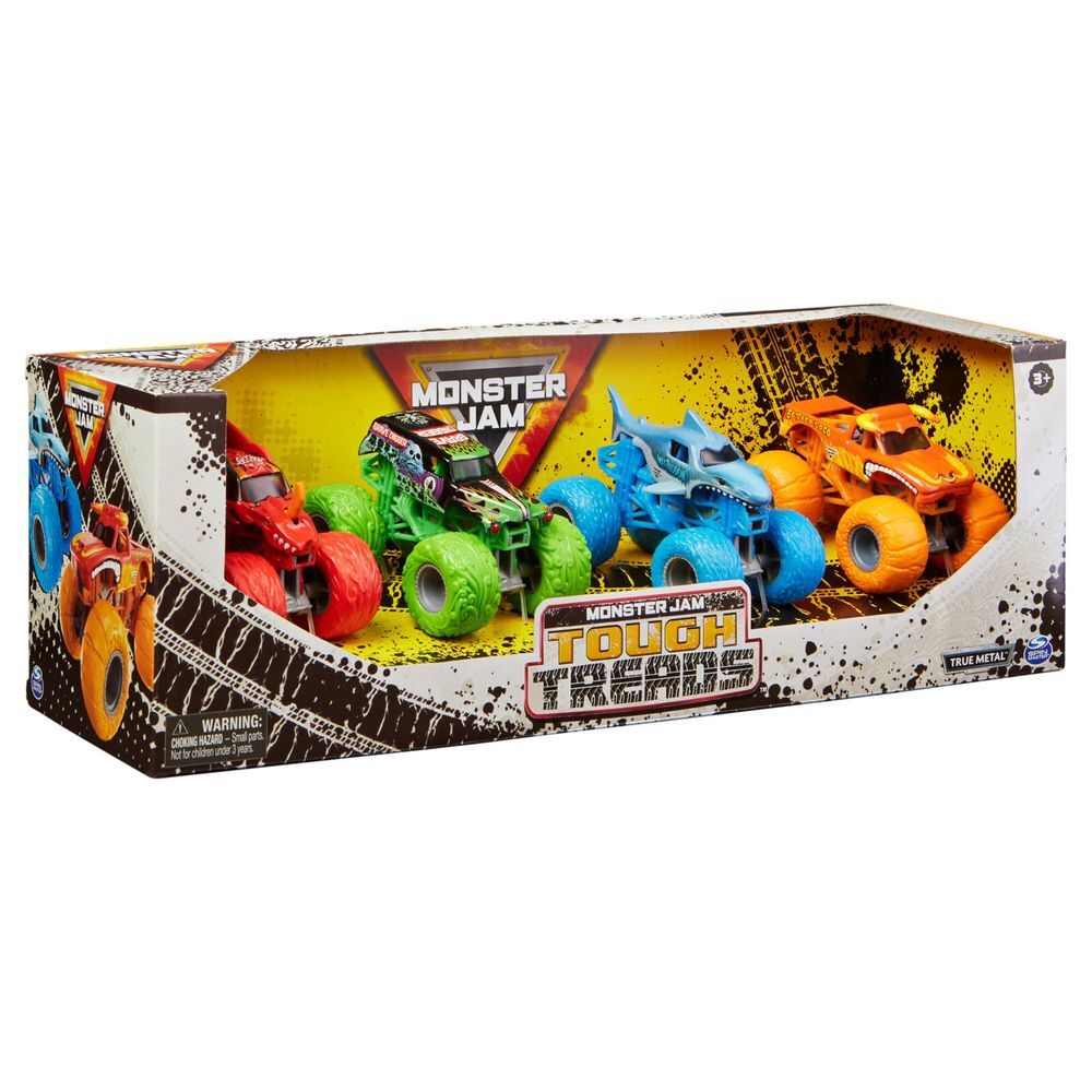 The Monster Jam Tough Treads lets you collect 4 epic Monster Jam Trucks with exclusive deco! This 4-pack of monster trucks includes El Toro Loco, Megalodon, Grave Digger, and Bakugan Dragonoid in 1:64 scale! These lean, mean, Monster Jam machines feature awesome details, and each toy truck has an authentic stylized chassis, official BKT Tires and a driver molded into the driver’s seat!