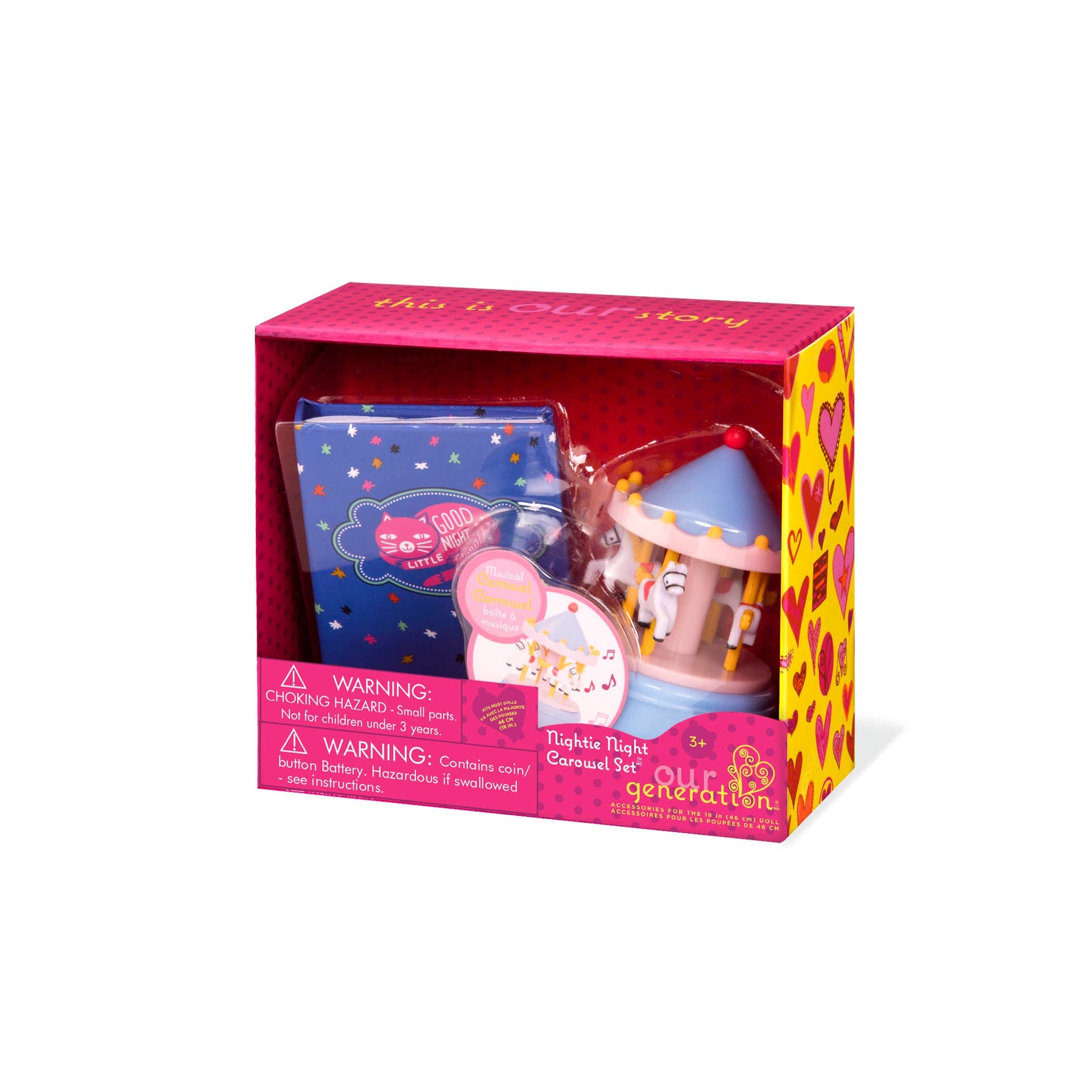 Get your doll ready for bedtime by playing a soft melody with this doll-sized carousel music box! Never have another bad dream with the Our Generation Nighty Night Carousel set. With a musical carousel, a bedtime storybook, bedtime has never looked so relaxing. This accessory set is compatible with most 18-inch dolls. Dolls and outfits sold separately.