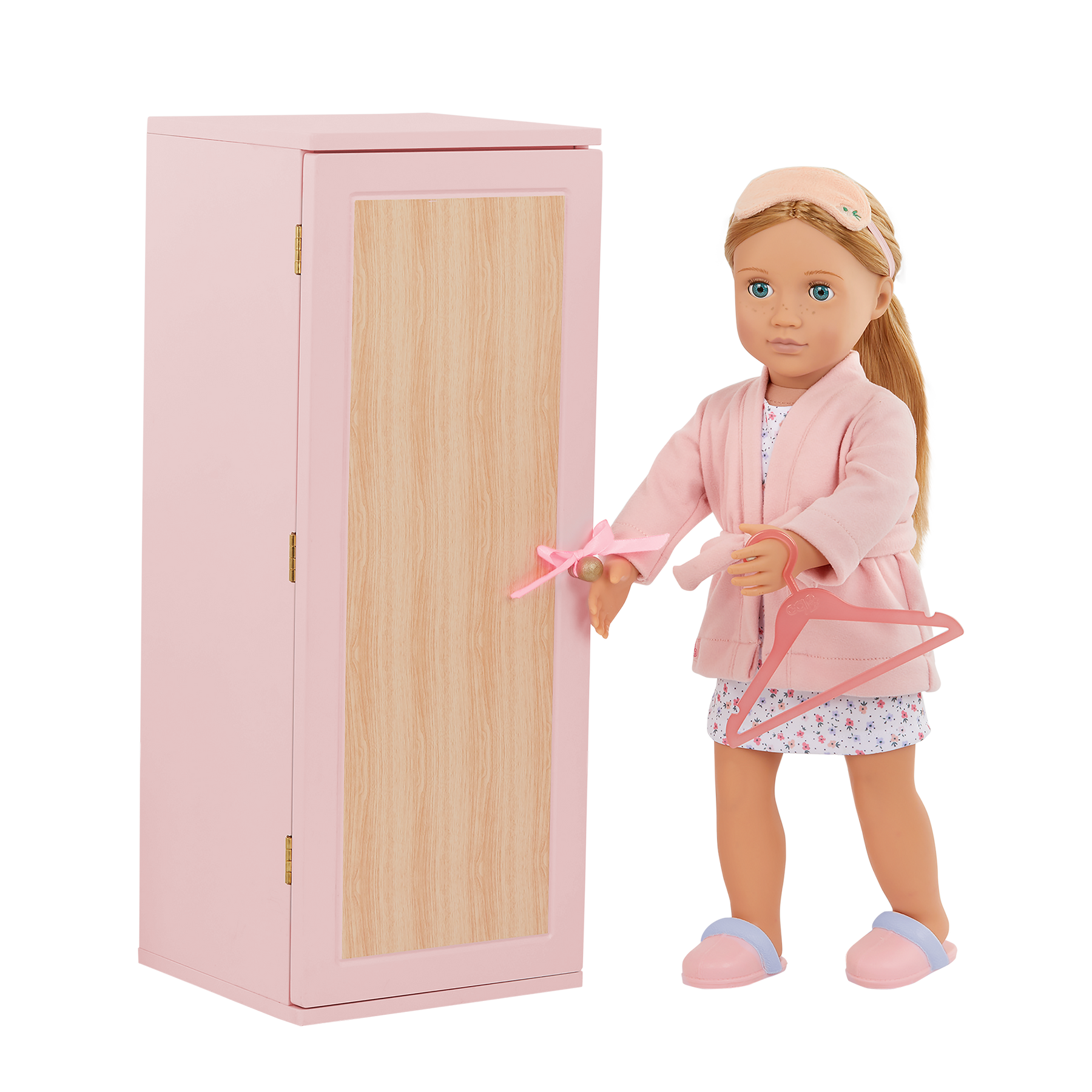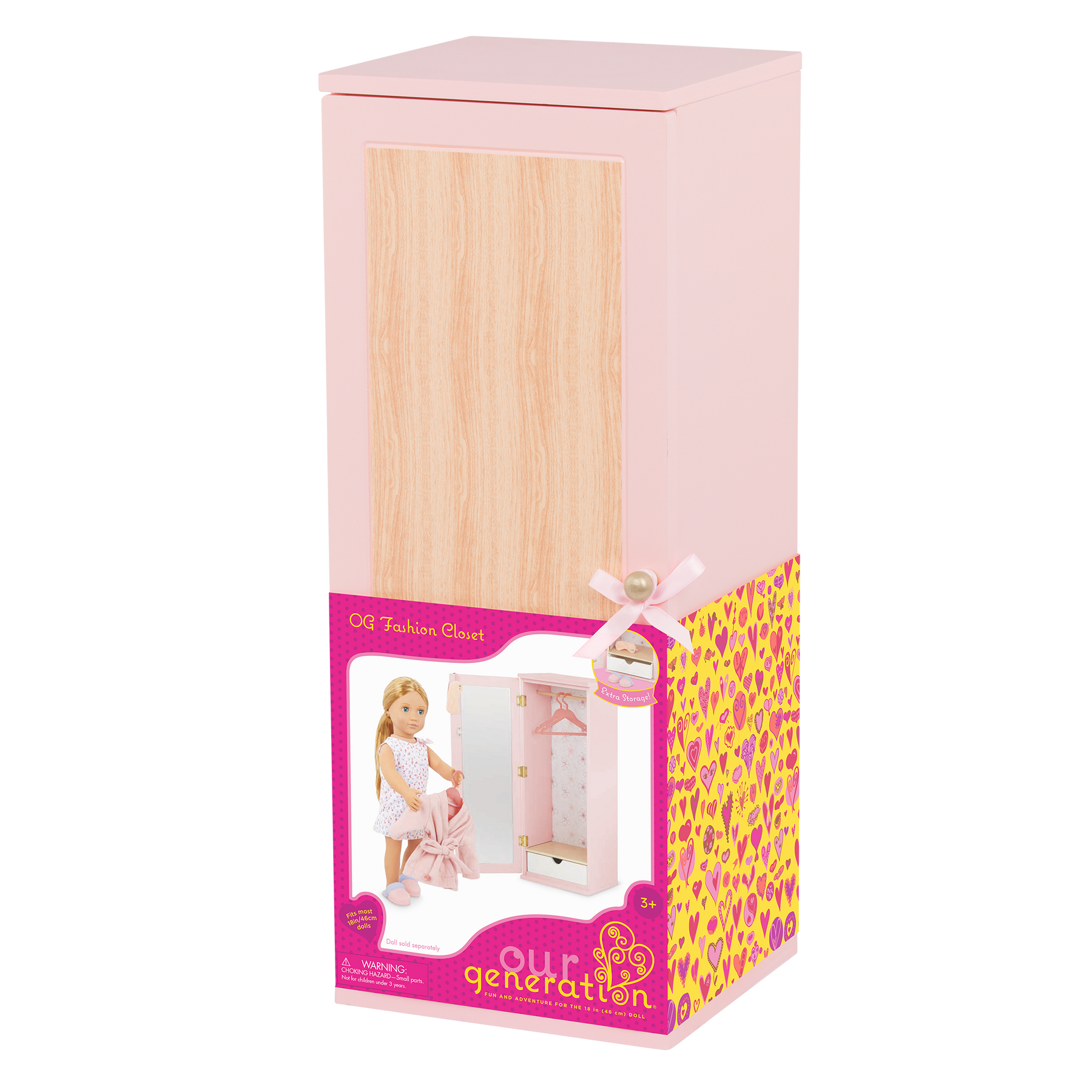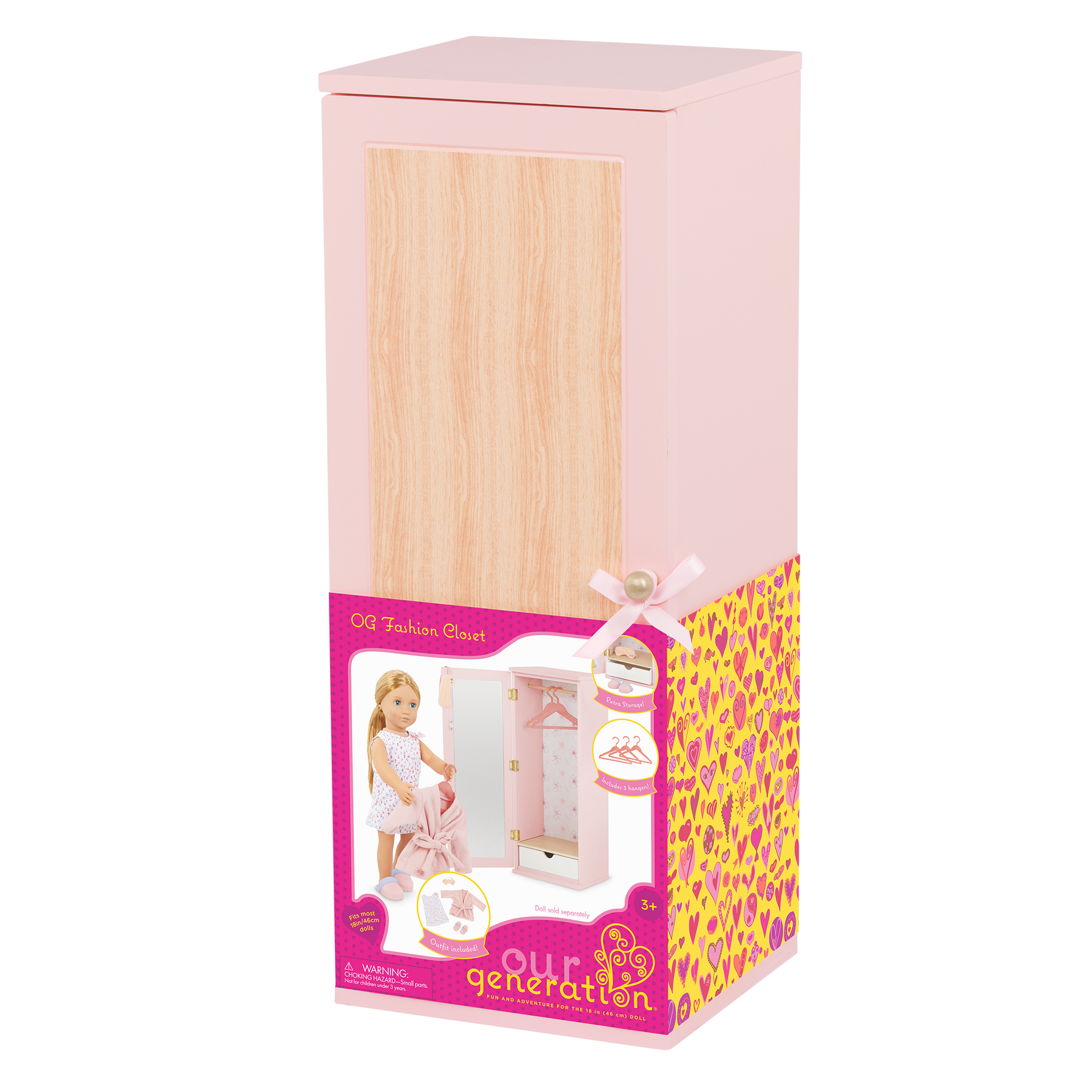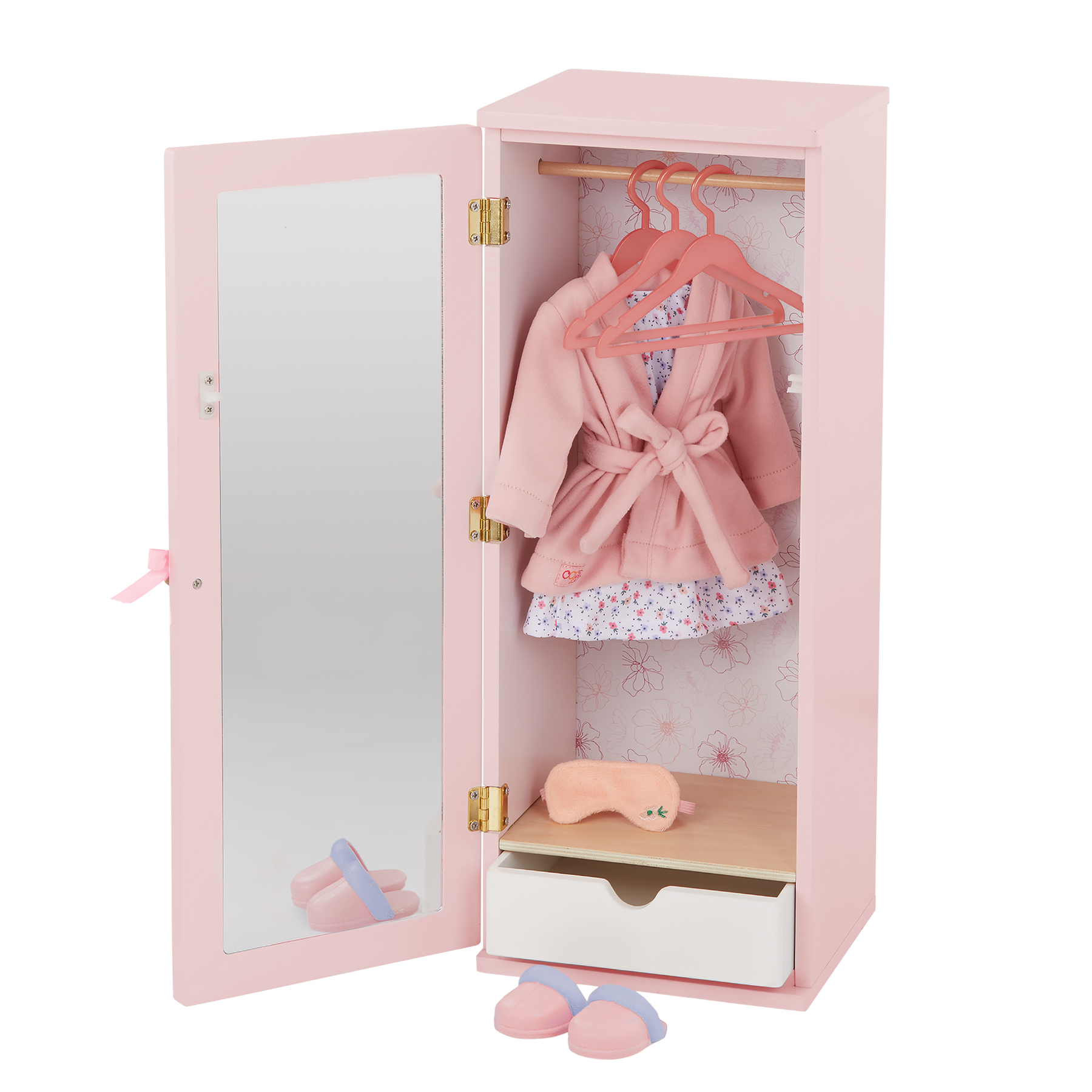 Store your 18-inch doll clothes and accessories in style with the Our Generation Fashion Closet! Made of wood, this modern wardrobe has an opening door that reveals a floral-print wallpaper and interior rod to organize tops, dresses, and jackets on the 3 clothes hangers. And when it's time for dress-up, the full-length mirror behind the door lets your dolls pick out the perfect outfit for their daily adventures! The closet also features a pullout drawer to store accessories like purses, hats, or folded outfits, with a convenient platform to display your doll's footwear - even cozy slippers! Included accessories like the eye mask, slippers, bathrobe, and nightgown start their clothing collection. The fashion closet arrives fully assembled, measures approximately 19" (H) x 7" (W) x 7.5" (L), and is the perfect addition to your doll's furniture sets. (Dolls sold separately)
