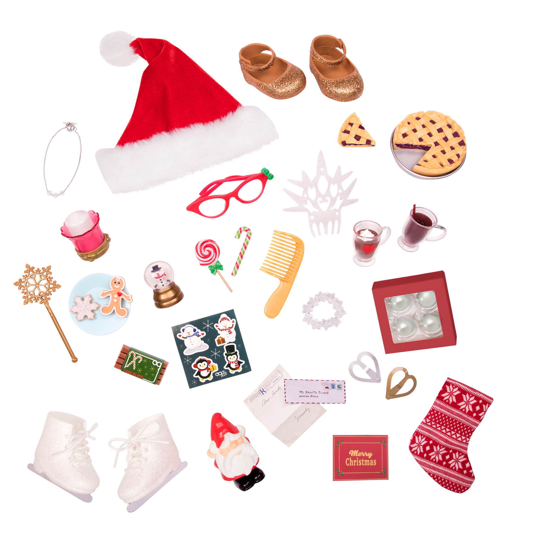 Discover a fun new item each day for your doll and share the joy with the Our Generation Holiday Surprise Advent Calendar! Grab your besties and count down the days by opening up the doors on the calendar box to reveal lots of fun accessories – including holiday-themed decorations, delicious sweet treats, and styling items! Then get creative with the coloring page on the inside box cover for an extra festive activity! This set features: an advent calendar box, a snow globe, a candle with holder, a stocking, a pair of skates and shoes, a candy cane, 4 ornaments, a Santa hat, a holiday card, a cup of cinnamon cider, 2 hair clips, a star bracelet, an envelope with letter, a sheet of stickers, a mug of hot chocolate, a plate with a cookie and ginger bread, a lollipop, a comb, a necklace, a wand, a chocolate bar, glasses, a gnome, and a tray of cherry pie! Which exciting accessory will you open up on the first day? (Dolls sold separately)