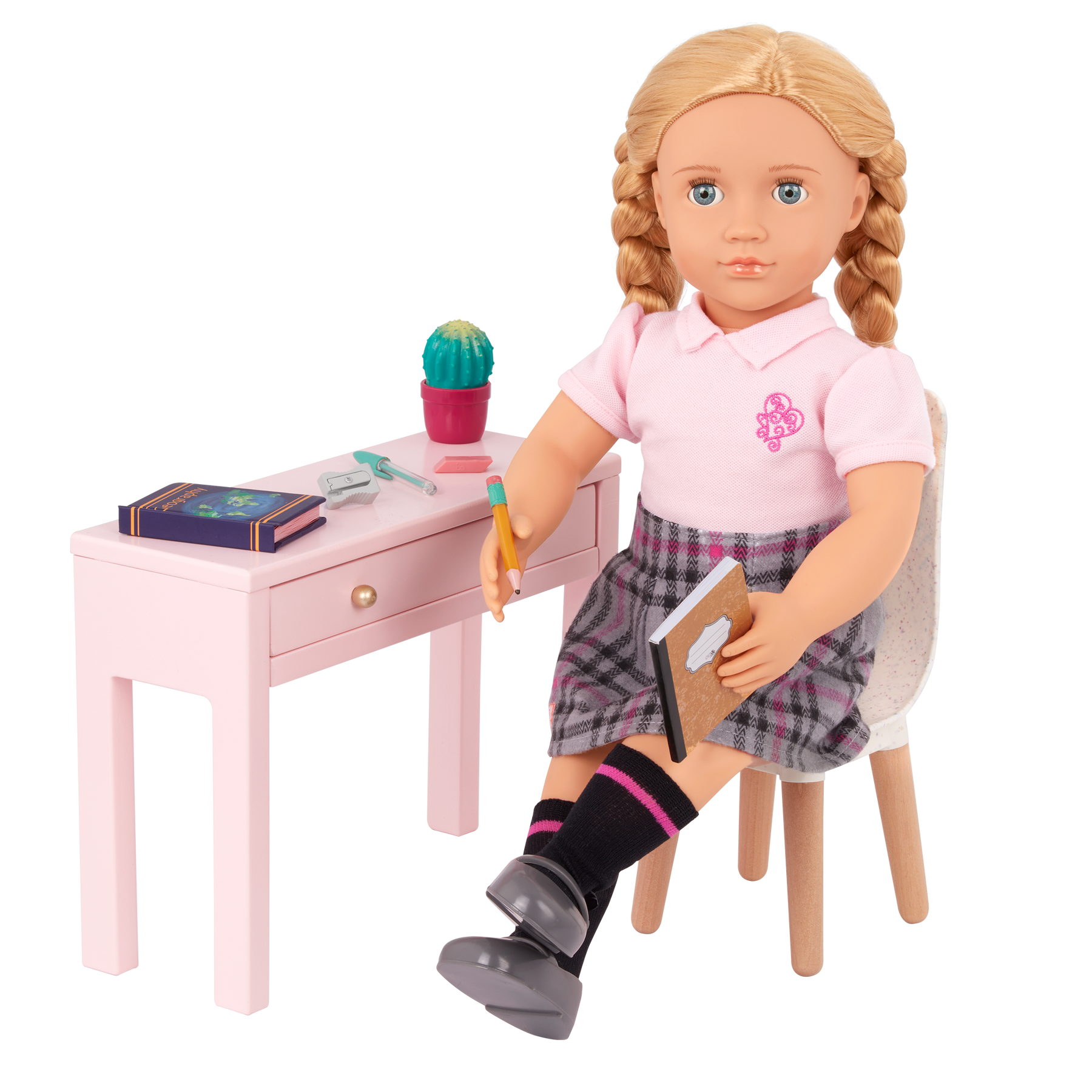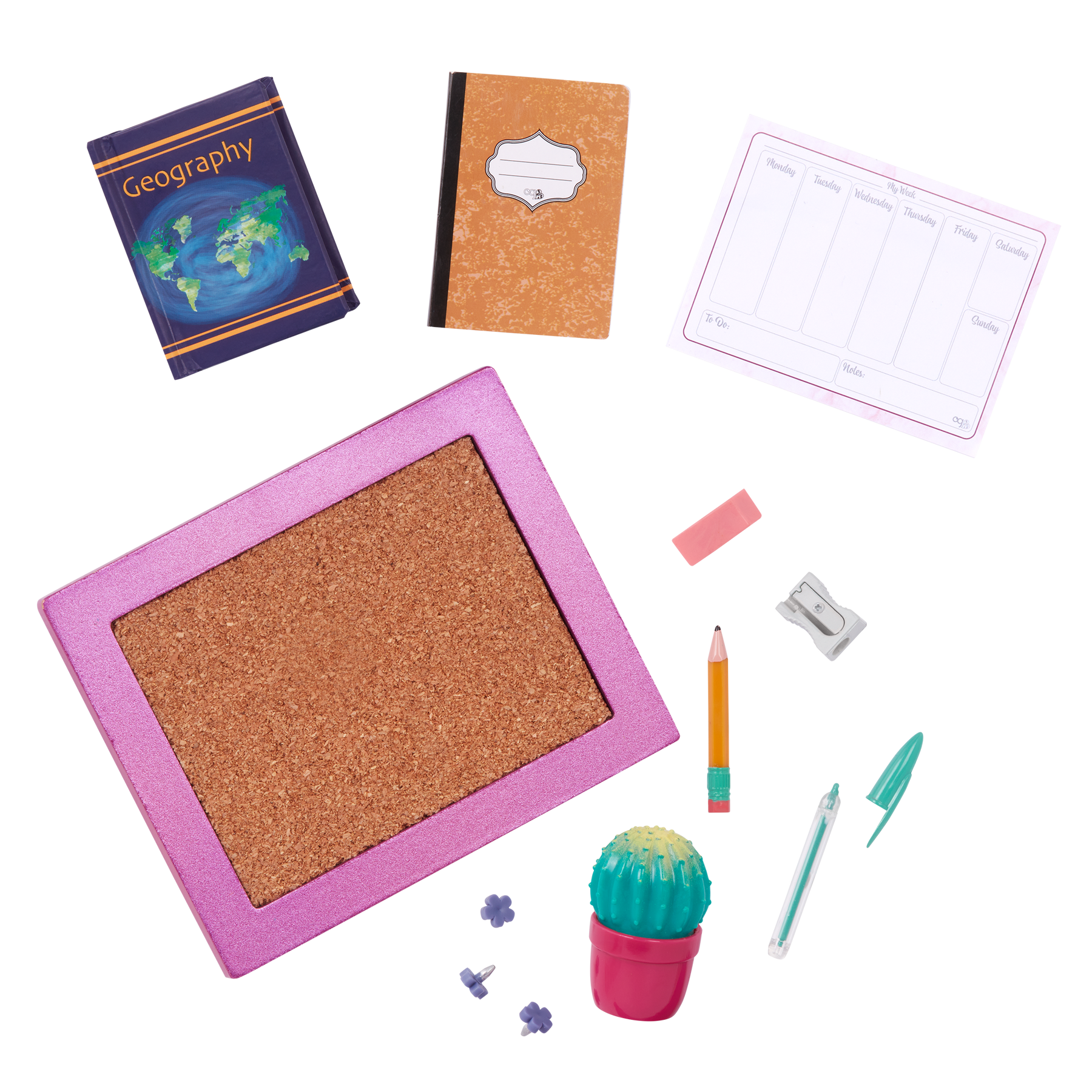 Design your 18-inch doll's workstation with modern decor from the Our Generation Working Wonder set! Perfect for dollhouses or on its own, arrange the furniture pieces to create your doll's dream space in your favorite play areas. Then redecorate for more stylish fun! The wooden desk has an opening drawer so your dolls can neatly store their accessories, like the notebook, textbook, pen, pencil, sharpener, and eraser. The weekly planner will help organize their essential tasks, and the real cork board with 3 safety push pins lets them hang notes, photos, and more! This complete home office furniture set is compatible with most 18-inch dolls and accessories. Dolls sold separately.