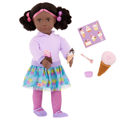 Serve up sweet fun with Ada! This Our Generation 18-inch doll has a huggable soft body and lifelike features to delight doll fans during playtime. Her light-brown eyes open and close, and her wavy, multicoloured hair is fun to style in many ways! Ada arrives in a cute ice cream-themed outfit. She wears a dress with a rainbow skirt and hooded top, sparkly tights, 2 pom pom hair elastics, and bright purple shoes. Plus, she comes with bonus accessories like 2 waffle cones, 2 swirls of ice cream, a bowl, a spoon, a sheet of real stickers, and an ice cream plush for added storytelling. When it's time for dress-up, her outfit has easy-open closures to quickly put on and remove. So you can mix, match, and create more stylish looks on any adventure! Our Generation dolls make a great gift for kids ages 3 years and older (small parts), encouraging them to imagine their own unique stories.