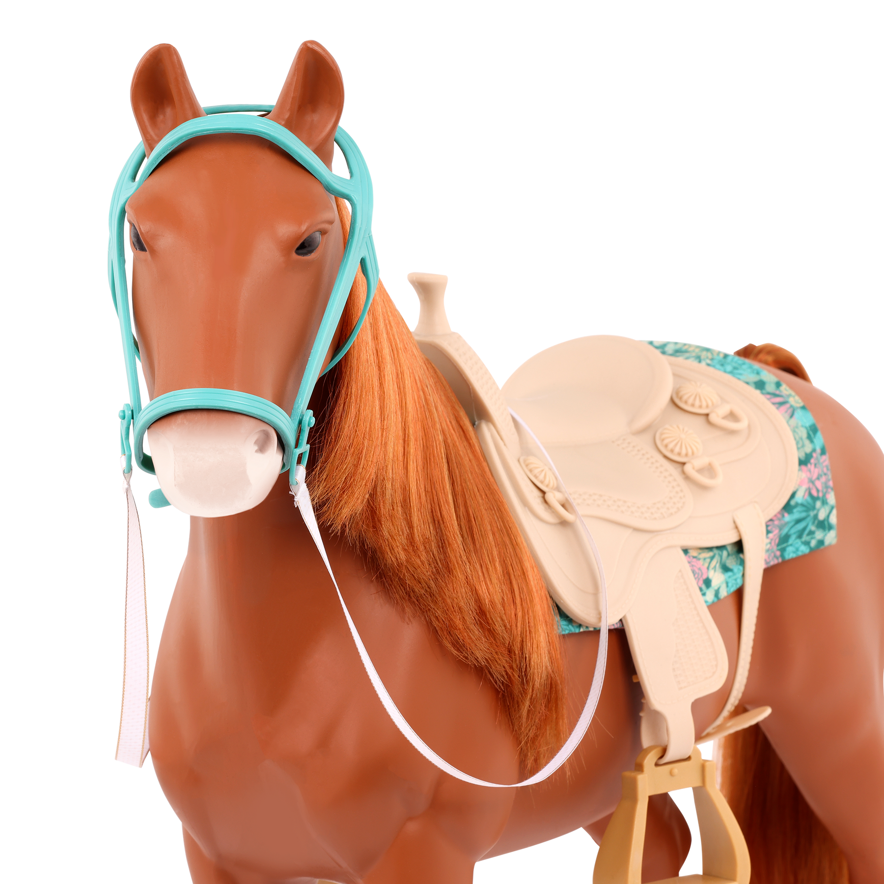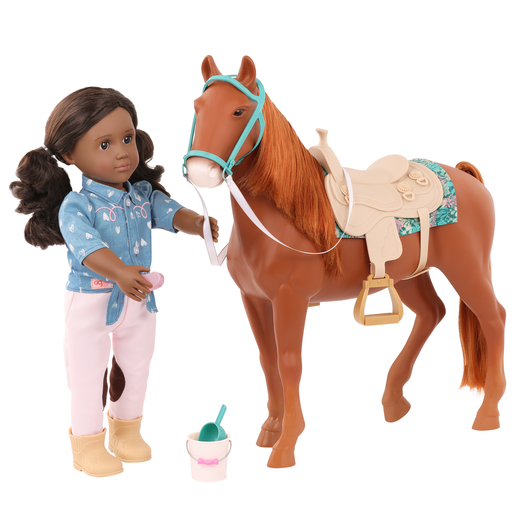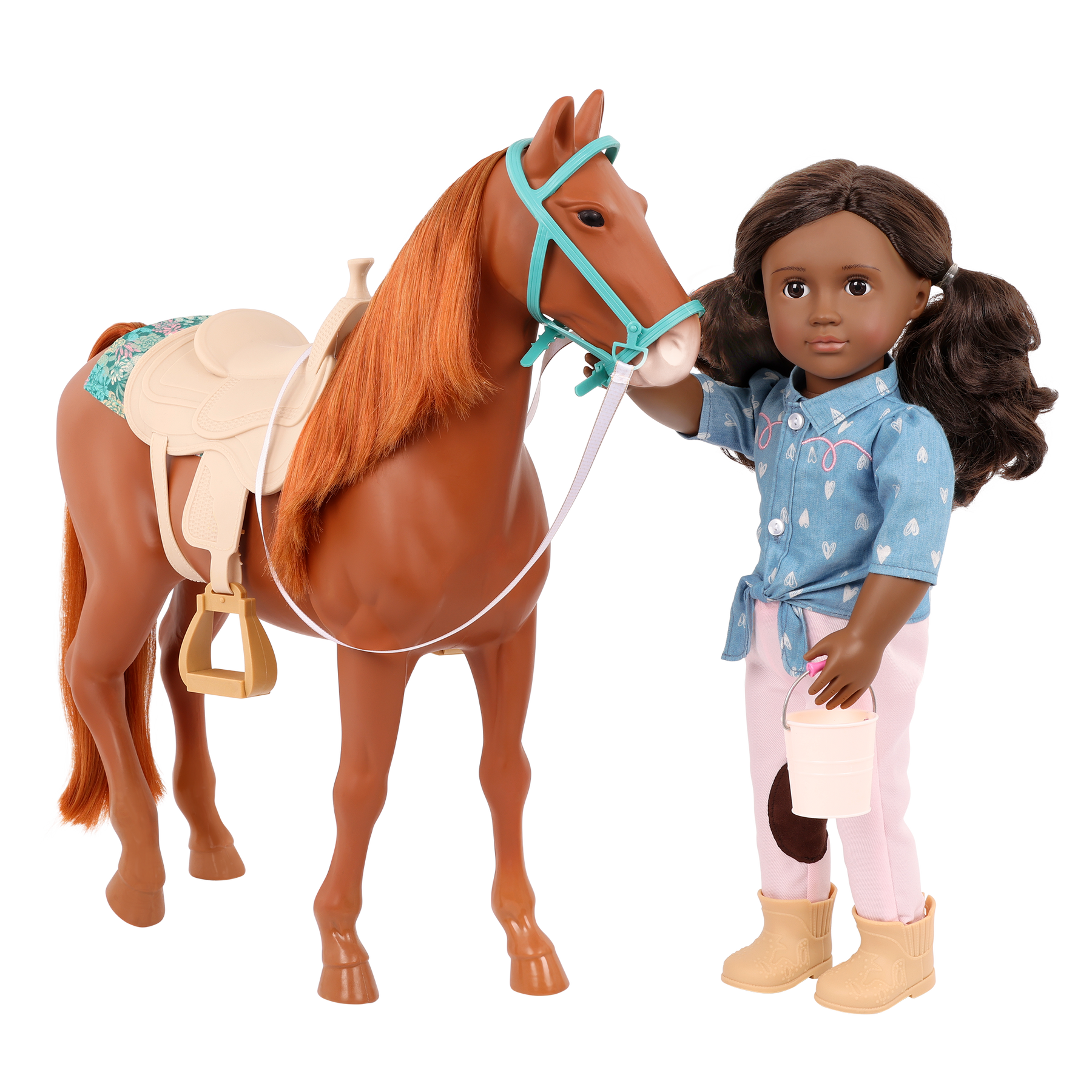 Gallop into adventure with the Our Generation 20-inch American Saddlebred Horse! This equestrian pal is perfect for 18-inch dolls to explore horseback riding fun. It has a shiny mane and tail, a removable saddle, and a stylish flowery saddle blanket. Plus, the included accessories like a grooming brush, scooper, bucket, and lettuce let kids care for their horse pal on every trail ride! Our Generation horses make a great gift for kids ages 3+ (small parts), encouraging them to imagine their own unique stories. Compatible with most 18-inch dolls, horse toys, and accessories. Dolls sold separately.